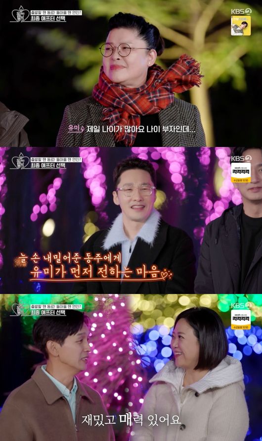 [OSEN=연휘선기자]'오래된만남추구'에서김숙과구본승,황동주와이영자,이재황과장서희의애프터데이트가성사됐다.23일방송된KBS2TV예능프로그램'오래된만남추구(약칭오만추)'에서는마지막선택의시간이펼쳐졌다.'오래된만남추구'는무인도에둘이떨어져도아무일없을거라고믿었던연예계싱글동료들이모여시작되는이야기를보여주는예능이다.1:1데이트이후한번더인연의촛불을밝힐애프터데이트선택이이어진상황.제일먼저선택에나선사람은김숙이었다.김숙은"더알아가고싶은사람이있다"며"오랜만에느끼는감정을저에게심어주신본승씨와의인연에촛불을밝히겠다"라고구본승을선택했다.실제김숙은'오만추'제작진과의인터뷰에서"사실누구한테잘보이고싶은생각이없어진지꽤됐다.그런데깔끔한모습도좀꾸미려고하고,말도조금예쁘게하려고했다.새로운감정들이아직나에게있다고느꼈다"라고밝혀뭉클함을자아낸바.이에구본승도화답했다.구본승은"되게여러가지모습이있더라.재미있고매력있잖아.억지로만들어진게아니라원래이사람의모습인것같더라"라며김숙을선택했다.이들은촬영이끝난뒤에도전화번호를교환하며제주도에서낚시데이트약속을잡아핑크빛설렘을자아냈다.방송내내화제를모아온오랜팬황동주와이영자(본명이유미)의만남도성사됐다."사실'역시나남자들은다그래'라는오해도있었다"라고밝힌이영자.그는"이재황씨를만나면서일단,민물장어세마리털렸다.상렬씨한테는멘탈이털렸다.내가.본승씨한테는옷이털렸다.다털렸다"라고고백해웃음을자아냈다.그러면서도이영자는"그런데이분은저를채워주기만한것같다"라며"남들이나이는숫자에불과하다고이야기하지만내입장에선내가여기서제일나이부자인데너무미안하다.되게고민하고있다.내가아무것도따지지않고한다면"이라고고심끝에황동주를향한인연의촛불을밝혔다.황동주역시"남이섬다녀오고확고해진마음이있었다"라며"저는그분덕분에제가연기자가됐다는거,방송인이됐다는거에대해서너무행복하다는마음을데뷔하고이렇게크게느껴본적이없는것같다.이런큰행복을주신분이있어서저는촛불을밝히겠다"라며이영자를선택했고,"그는지금까지뵌건너무짧은시간이었기때문에가능하다면한번더뵙고얘기도하고싶고,저는이유미씨와인연의촛불을밝히겠다"라고말해설렘을더했다.이밖에도이재황과장서희가'아내의유혹'에서15년전극중인연으로재회해서로를선택했다.반면지상렬과우희진은고심끝에촛불을밝히지않았다.이에단2회만남은'오만추'에서애프터데이트촬영과최종선택이어떻게펼쳐질지호기심을자아냈다./[email protected][사진]KBS제공.Copyright©OSEN.무단전재및재배포금지.