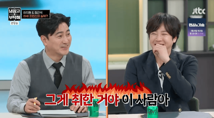 JTBC예능‘냉장고를부탁해’배우장근석이무근본술부심을드러냈다.23일방송된JTBC예능‘냉장고를부탁해’(이하‘냉부해’)에는장근석·하지원이출연했다.이날장근석은자신의음주습관에대해“많이먹기보다즐기는편이다.주량은취해본적이없어서모르겠다.많이마시면잠깐피곤해서잔다”고밝혔다.또장근석은‘술을가장많이마신적이있냐’는물음에“예전에추성훈과와인12병마셨다.롯폰기에서마셨는데성훈이형이길위에서수영하고있더라.그래서좀많이놀랐다.추성훈은그냥못먹는사람”이라고말해웃음을안겼다.사실확인을위해장근석은추성훈에게전화를걸었다.전화를받은추성훈은“와인을많이마셔서수영한건맞다.근데옆에서같이수영하던친구가있다.재미있게수영했는데앞으로안간다.(장근석은)나보다훨씬술약하다”고폭로했다.이에장근석은“꿈꾸신것같다.나는(추성훈의주사를)다지켜봤다”며계속해서허세를부렸다.이상황을지켜보던하지원은“내가보니까본인이인정만안하는것같다”고팩트폭행을해웃음을안겼다.장정윤온라인기자[email protected]©스포츠경향.무단전재및재배포금지.