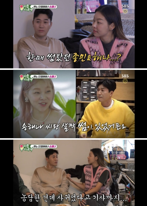 ▲사진|'미우새'방송화면[스포티비뉴스=배선영기자]송해나가과거김종민과의스캔들을언급했다.송해나는9일방송된SBS'미운우리새끼'(이하미우새)에출연했다.이날절친한이상민,김종민,배정남이송해나의집을방문한가운데,이상민은"예전에김종민과송해나가썸을탔다는기사를본것같다"라고말했다.실제이날방송에는김종민이과거한방송에서썸탄사이라고인정한내용이공개됐다.김종민은"농담한건데사귀었다고기사까지났었다"라고말했고,송해나도"오빠유튜브까지나가서해명했다"라고말했다.배정남은"사귄건아닌데썸은탄거냐"라고묻자,두사람은"썸도아니었다"라며부인했다.또이날방송에서김종민이송해나때문에여자친구와도싸웠다는사실이밝혀졌다.김종민은"사귀던초반에그런기사가났다.오해가좀있었다"라고말했다.송해나는미안해하며"오해사지않게행동하겠다"라고말했다.<저작권자ⓒSPOTVNEWS.무단전재및재배포금지>Copyright©스포티비뉴스.무단전재및재배포금지.