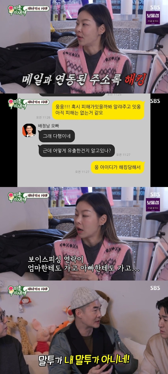 ‘미운우리새끼’사진|SBS송해나가보이스피싱을당했던과거를언급했다.9일오후방송된SBS예능프로그램‘미운우리새끼’(이하‘미우새’)에는송해나집에초대받은이상민,배정남,김종민이모습을보였다.이날방송에서송해나는“정남오빠를20년전부터알았잖아요.제가고마운게좀있어요.오랜만에오빠한테연락이왔는데그게보이스피싱관련한거였어요.막영어로메일이온거예요.제가그걸확인버튼을그냥누른거예요.근데며칠이따가주변사람들한테돈빌려달라고싹다간거예요.포털사이트에저장돼있던주소록이털린거예요.부모님이랑친척들한테다갔는데정남오빠한테연락이왔어요”라며당시를회상했다.배정남은“해나가돈빌려달라고하는데말투가이상한거야.그래서물어본거지.너맞냐고”라고했고해나는“그래서저아니라고.오빠무슨소리예요?전그런거보낸적없다고했어요”라고답했다.송해나는“정리가되는듯했거든요?그런데오빠가톡말고문자로연락이와서문자로답을했어요.그런데동시에톡으로또연락이오는거예요.이미문자로마무리인사까지다했는데”라며당시사기범과주고받은톡내용을보여줬다.배정남은“이게내말투가아니네.‘도용당한거어떡할거야?’가아니고‘어떡할끼고?’이래야지.하수네”라며어이없어했다.‘미우새’는매주일요일오후9시5분SBS에서방송된다.[서예지스타투데이객원기자]Copyright©스타투데이.무단전재,재배포및AI학습이용금지