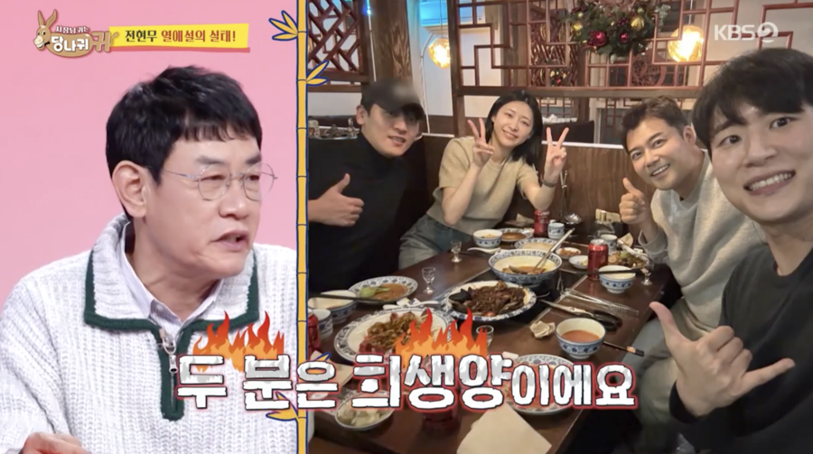 ▲사진|'사당귀'방송화면[스포티비뉴스=배선영기자]전현무와홍주연아나운서가사석에서만난자리가공개됐다.9일방송된KBS2'사장님귀는당나귀귀'(이하사당귀)에서엄지인아나운서는"전현무선배제보할게있다.홍주연아나운서,이광엽아나운서,김진웅아나운서와함께식사를했다"라고말했다.이날방송에서는사진한장이공개됐는데,전현무와홍주연아나운서가함께식사하는장면이었다.이자리에는이광엽아나운서,김진웅아나운서도함께있었다.해당사진을본김숙은"홍주연씨먹이려고간거다"라고말했고,이날게스트로출연한이경규역시"남자두분은희생양이다.홍주연씨를먹이기위해서옆에병풍을세워놓고저런연애를하는거다"라고말했다.박명수는"(전현무)치아가다보였다.진짜다.사실혼이라는소문이맞다"라고말했다.이경규가"아이도있다던데?"라고말하자스튜디오에서는야유가터져나왔다.해당열애설에적극부인하지않고한술더뜨는태도로대응해온전현무는"이제상상으로'슈돌'도나가겠다.당나귀'최고의콘텐츠다"라며웃었다.한편이날전현무는지난방송이후불거진3월결혼설에대해"아니,하다하다3월결혼설은뭐냐.우리엄마가전화가왔다.엄마가'너3월에결혼해'라면서전화왔다.또츄도'오빠축하해요'라며전화왔다.뭐냐이게.사실아닌게너무많다"며전격부인했다.그러나이내박명수가"그러면5월로하자"라고말하자전현무는"그럼5월"이라며"이러면또기사난다.5월로정정이라고기사나온다"라고했다.<저작권자ⓒSPOTVNEWS.무단전재및재배포금지>Copyright©스포티비뉴스.무단전재및재배포금지.