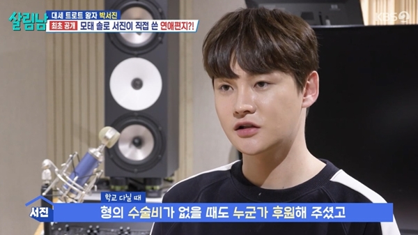 살림남2박서진/사진=KBS2캡처[스포츠투데이임시령기자]'살림하는남자들시즌2'박서진이모교사랑을드러냈다.8일방송된KBS2예능프로그램'살림하는남자들시즌2'에서는가수박서진이모교를찾는모습이공개됐다.이날박서진은모교축사를하게됐다며"제가졸업한초등학교가개교120주년을맞이했다.그래서저를초대해주신것같다"고말했다.이어"학교다닐때형의수술비가없을때누군가가후원을해줬다.급식비가밀려서난감해하고있을때장학금으로후원해줬다며"분명히저처럼도움이필요한학생이있을거란생각에상처받지말라고더기부를하고있다"고얘기했다.박서진은"올해로4년째후원중"이라고해놀라움을안겼다.[스포츠투데이임시령기자[email protected]]Copyright©스포츠투데이.무단전재및재배포금지.