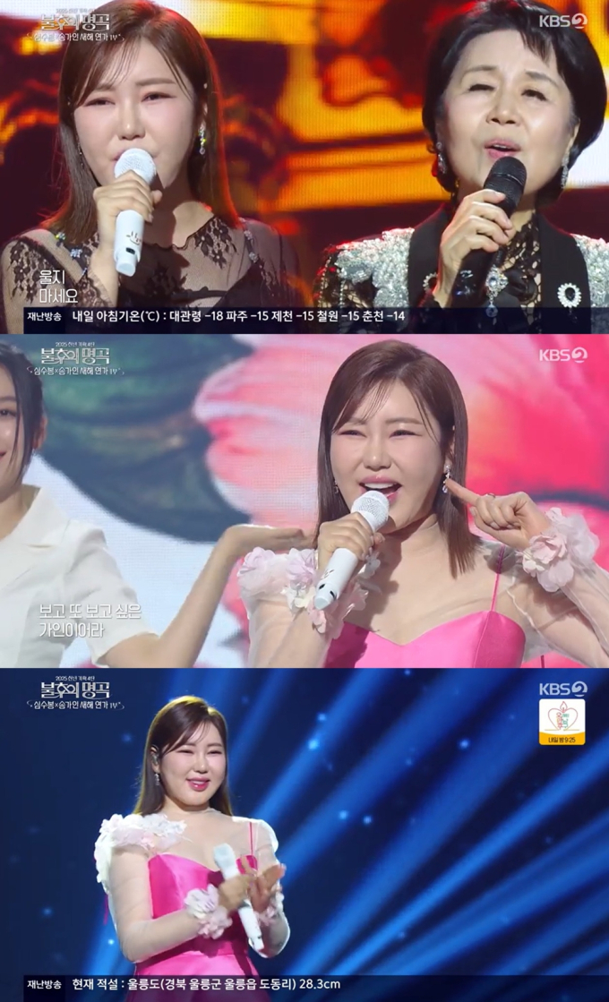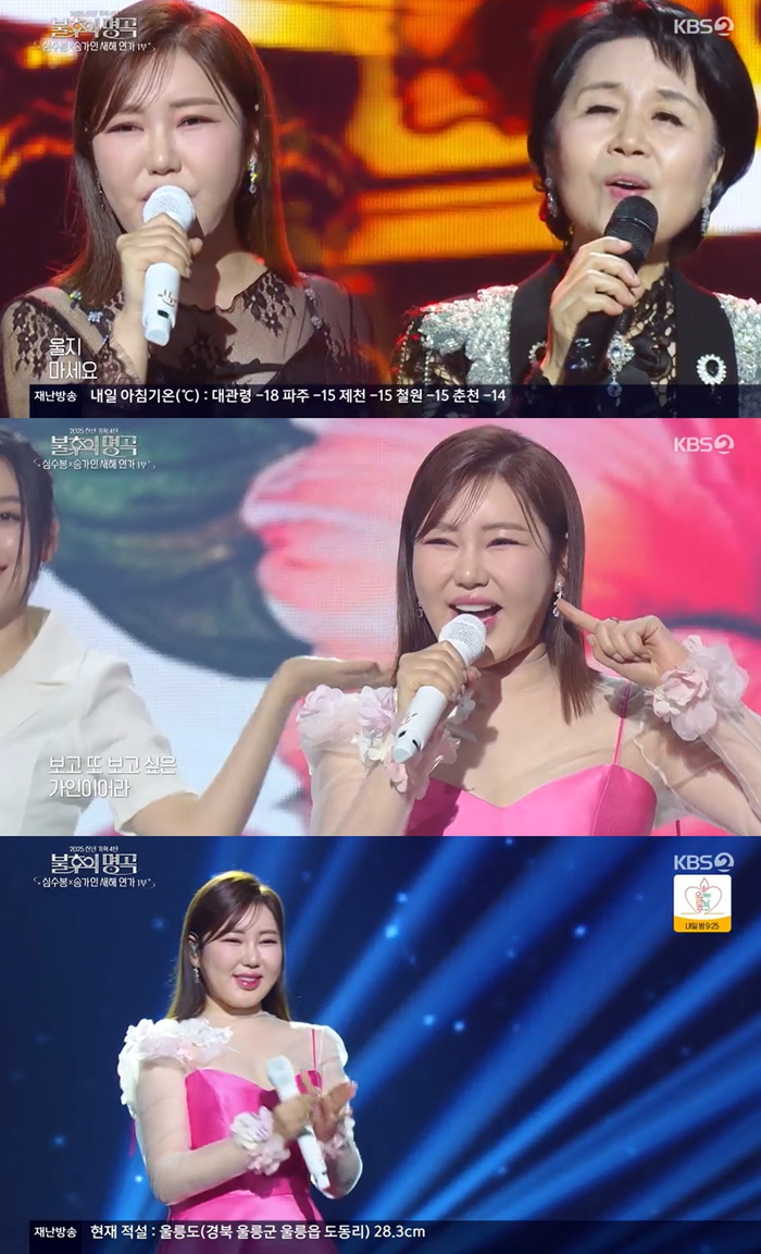 예능‘불후의명곡’(제공:KBS2)가수송가인이심수봉과정규4집타이틀‘눈물이난다’무대를최초공개했다.지난8일방송된KBS2‘불후의명곡’은‘2025신년기획4탄:심수봉&송가인의새해연가’특집으로꾸며졌다.이날먼저‘가인이어라’무대를선보인송가인은첫곡부터완벽그이상의무대를완성하며‘불후의명곡’분위기를끌어올렸다.무대를마친송가인은“심수봉선생님첫번째제자다.4집앨범을발매하는데,선생님께곡을받고싶어서무작정찾아갔다”라고밝혔다.송가인은“‘눈물이난다’라는곡이다.저는진짜복받은사람”이라며감격했다.송가인은“오늘선생님과‘눈물이난다’듀엣무대를선보일예정”이라며기대감을한껏모았다.이어송가인은‘개똥벌레’로분위기를이었다.간드러지는목소리와사랑스러운미소로감동을자아내는가하면,‘엄마아리랑’으로우아한한국전통미가담긴무대로관객들에게뜨거운반응을얻었다.마지막으로송가인은심수봉과함께‘눈물이난다’무대를최초공개했다.‘눈물이난다’는심수봉이직접프로듀싱한곡이자송가인의정규4집‘가인;달’타이틀곡이다.이번무대는트롯레전드’와‘트롯여제’의만남인만큼의미가남달랐다.송가인과심수봉은애절함을극대화한무대로깊은몰입도를선사했고,그어디서도볼수없었던레전드듀엣무대로안방극장1열을장악하기도했다.한편송가인은오는11일오후6시저규4집‘가인;달’로컴백한다.정윤지기자[email protected]뉴스연예팀기사제보[email protected]©bnt뉴스.무단전재,재배포및AI데이터활용금지