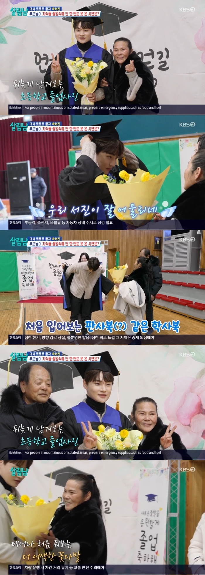 ‘살림남’.사진lKBS이민우가트로트가수에도전한다.8일오후방송된KBS2‘살림하는남자들시즌2’(이하‘살림남’)에는박서진과이민우가모습을보였다.이날방송에서는박서진이첫번째살림남으로등장했다.서진이늦은밤무언가를끄적이자동생효정은“뭐야?연애하나?”라며방해했다.종이를손에쥔효정은“행복하고설레이는...늘아끼고더사랑하는?누군데?차근차근뭘만들어?사랑을만들어가나?예쁘냐고?”라며서진을날려웃음을자아냈다.효정은“엄마,아빠호외요호외~너무행복하고설렙니다.어떤말을전해야할지오랜시간생각했습니다.꿈을이룬날이오긴하네요.늘더아끼고사랑하는...”이라며부모님앞에서서진의글을읽었고부모님은“연애하나?”라며놀랐다.이에서진은“아니라고!”라며반박했고아버지는“연애할나이인데뭘”이라며서진의연애를응원했다.이틈을타효정은또한번“힘들어도그것만생각하면너무나행복했습니다”라며글을읽었지만서진은다시글을빼앗았다.그는“내일축사할때읽을글이라고.내일내가졸업한초등학교가서축사하기로했단말이야”라고답해패널들을놀라게하기도.서진은“제가나온초등학교가개교120주년을맞이했거든요.그래서저를초대해주셨어요.학교다닐때형의수술비가없을때도누군가후원해주셨고급식비내기힘들었을때도누가후원해주셨고분명히지금도이런상황의아이들이있을거예요.그래서상처받지말라고기부를좀...”이라고말해감동을안겼다.어머니는“우리아들이초등학교에서축사한다고?이제성공했으니박수한번쳐주자”라며손뼉을쳐줬다.이어“너희들이엄마,아빠걱정안하도록잘자라줬고이만큼커준것도너무감사하다”라며서진과효정에게고마움을표현하기도.축사당일,서진은고향곳곳에걸려있는본인의‘KBS신인상수상’현수막을보며삼천포초등학교로향했고후배들의환영을받으며교장실에들어갔다.서진과효정은교장이건넨생활기록부를보며추억에잠겼다.효정의생활기록부를든서진이“구구단을다외워곱셈에대한자신감이크게늘었으며실수도많이줄어들었으나나눗셈을잘이해하지못해문제풀기를주저함”이라고읽자효정은“4학년때아이가?그땐당연히힘들지”라며코웃음쳤다.효정은서진의생활기록부를들고“계산이느리고정확하지못하여문제를해결하는능력이떨어짐.글을읽는능력이부족하여글읽기를싫어함”이라고반격했고한보름은“곧축사하실텐데읽는능력이부족하시면...걱정되는데요?”라며걱정했다.이에서진은“비만의원인과예방법을알고있음”이라며효정을공격했고효정은“그럼당연히알고있지!다알고어떻게찌는지먹은거지”라며너스레를떨어웃음을자아냈다.이후서진의축사가시작,그는“늘여러분들을자신보다더아끼고사랑하는가족과선생님그리고제가여러분들을응원하겠습니다.졸업축하합니다”라며무사히축사를마무리했다.이때서진의부모님이찾아왔고서진이“왜왔는데?”라며시큰둥해하자부모님은“졸업할때못왔잖아”라며미안하다는듯이꽃다발을건넸다.이어아버지는“아빠는효정이한테도미안해.막내딸졸업식도못가고”라며함께사진을찍기도.어머니는“이제와기분풀어준다고하는게미안한마음도들지만늦었어도같이한번해봤다는게고맙고미안해요”,아버지는“우리가없이살았을때못해줬던거이제집사람이랑하나하나우리아들,딸챙겨서한번해보려고요”라며인터뷰에서소감을전했다.‘살림남’.사진lKBS두번째살림남으로는신화의이민우와그의가족이모습을보였다.어머니는“올해좋은소식이있을것같아”라며“너지금소속사가...정리했지?”라며조심스레물었다.이민우는“새해가되면서소속사와계약이끝났어요.제꿈을펼치고자새로운파트너를알아보고있다”라고인터뷰에서답했다.이후어머니는트로트프로그램을틀며“우리아들도저런데나왔으면좋겠다.네가노래부르는거한번보고싶다.죽기전에한번보여줘라.좋은곡받아서트로트할만한인맥없어?뭐라도네가발벗고나서야해.네가발전시켜봐봐”라며소원을전했고이민우는“아그만좀해”라며자리를떴다.아버지는“우리민우가팬들이많았거든.근데이제팬들도줄어드는데핀잔받을까싶어서말을못꺼냈단말이야”라며민우를걱정하는마음을보였다.다른날민우는코미디언허경환을만나어디론가향했다.경환은“형을위해특별한인맥을준비했어요.임영웅도이분앞에서는긴장할거예요”라며설운도를소개했다.설운도는“지금은감사하게도아이돌후배들이트로트시장으로많이넘어오다보니까”라며트로트를준비한다는이민우를보고“축하하네”라고답해웃음을자아내기도.이어이민우가트로트분야에서도전할수있냐는허경환의질문에“너부터먼저하자”라며허경환과이민우를시험했다.허경환은‘보라빛엽서’를열창,설운도는“멜로디를잘모르나?그건개그고노래는그게아니지”라며꾸중했다.다음으로이민우의차례,춤까지추며열창하는민우의‘사랑의트위스트’를들은설운도는“지금트로트무대에서도손색없어!그런데노래는리듬을더타야해!이노래의포인트는엇박자야.쿵이아니라더뒤에들어가야해.다시해봐”라며특훈하기도.설운도의특훈을받은이민우는‘사랑의트위스