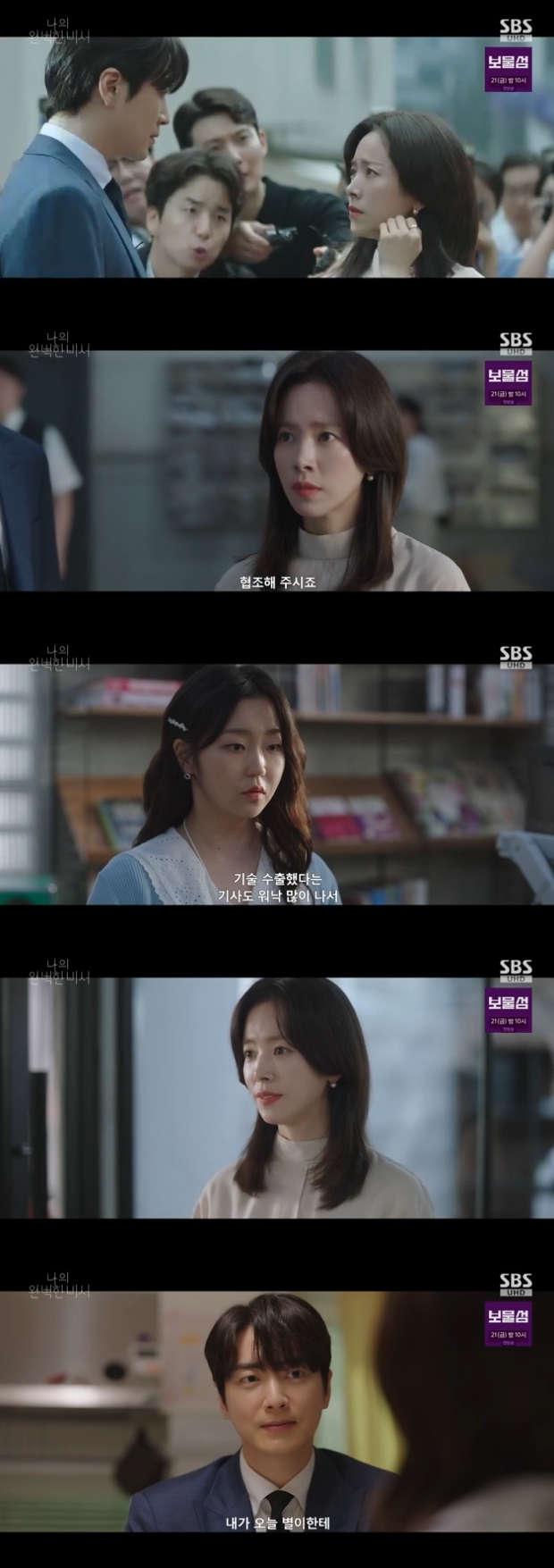 사진=SBS'나의완벽한비서'[스포츠한국김현희기자]한지민이박보경의계략에의해결국,'피플즈'대표직에서물러나게됐다.8일방송된SBS금토드라마'나의완벽한비서'(연출함준호·김재홍,극본지은)에서는'피플즈'가'이코닉바이오'투자사기에연루된모습이그려졌다.이날'이코닉바이오'박영민(고상호)대표가200억을가지고잠적해'피플즈'는경찰로부터압수수색을당했다.이와더불어강지윤(한지민)은사기에가담한것이아닌지에대한의심을받았다.또한,'피플즈'가압수수색당했다는기사가뜨자거래회사들은계약해지를요청해왔고,회사는위기를직면했다.이가운데김혜진(박보경)이박영민대표와함께있는모습이포착됐다.이때김혜진이'피플즈'를위기로몰아놓은것이드러났다.이에박영민은김혜진에게왜그랬냐고묻자"피플즈대표가재수없어서"라고말했다.강지윤은모든회사직원들을불러모아"절대로부끄러운짓을하지않았다"고해명했다.이와동시에우정훈(김도훈)은자신의아버지우철용(조승연)을의심했다.이때우철용은자기가하지않았다고함과동시에"지켜보는중이니'피플즈'정리하고회사로들어오라"는말을건넸다.이에우정훈은싫다고했고,이여파로집에서쫓겨나게됐다.강지윤은유은호(이준혁)에게"무섭다"고고백했고,유은호는"괜찮다"며그를꼭끌어안아줬다.유은호는강지윤이걱정돼잠이드는것을확인한후집에가겠다고했다.강지윤집에같이있던중'이코닉바이오'에투자했던이들이몰려와소란을피웠다.이에유은호가나서이들을막았다.결국,안전하지않다는것을느낀유은호는강지윤을자신의집으로데리고갔다.집에서유별(기소유)과만나게된강지윤은유별에게"신세좀지겠다"고했다.이어유별은강지윤에게비타민을건네며"우리아빠힘들때주는약이다"라며강지윤을응원했다.이후유별과함께침대에누운강지윤은유별이불러주는자장가를들으며깊은잠에빠졌다.'피플즈'1팀멤버들은도담책방에모여이사기사건에대해의문을가지며사건을파헤치고자했다.이때누군가함정을파놓은것아닌지를의심했고,의심되는인물들을나열하며진실을찾고자했다.사진=SBS'나의완벽한비서'이가운데강지윤에대한안좋은기사가새로보도됐고,이에유은호는강지윤을찾으러집에갔으나강지윤은김혜진대표를만나러간상태였다.이모든것이김혜진의계략임을안강지윤은김혜진에게"5년전일이이타이밍에이렇게회자되냐"며"참몰아가는것잘한다.나에게이렇게까지하는이유가뭐냐"라고하자김혜진은"네가싫다.잘난척하는것도,다른인간인척하는것도싫다"라고했다.그러면서김혜진은5년전일을언급하는강지윤에대해"너네회상망해가는데나에게애원을해라.내약점을가지고협박을하던지.네가이래서싫다"라고했다.회사에온강지윤은우철용과만났다.강지윤은우철용에게조사를통해결백한것이들어날것이라고설명하며곧정상화를하겠다고약속했다.하지만우철용은이에대해신뢰가깨졌다면서강지윤에게대표직에서물러나라고했다.우철용은"대표자리에서물러나게되면직원들자리는보장하겠다"라고했다.이에강지윤은"제가만들고꾸린회사다.그럴수없다"라고했다.우철용은이에"피플즈인수하려는회사가있다.잘생각해봐라"라고하자강지윤은김혜진을의심했고,우철용은자리를떠났다.바다를보러간유은호와강지윤은풍경을바라보며잠시나마휴식을취했다.강지윤은유은호에게"은호씨를만나고참많은것이변했다"며"난항상나혼자모든것을책임진다고생각했는데책방에서직원들을보고혼자가아닌것을알았다.은호씨가아니였으면몰랐을것이다"라고했다.이에유은호는"지윤씨혼자아니다.앞으로도그럴것이다"라고했다.이때유은호는강지윤을위한깜짝선물을준비했다.유별과미리강지윤에게줄목걸이를준비한유은호는바다가보이는예쁜풍경앞에서강지윤에게전했다.이를받은강지윤은"목걸이너무고맙다"며"은호씨만나서내가조금더좋은사람이됐다.내인생이나는너무싫었는데이제는조금은좋아졌다"고했다.이에유은호는"지윤씨가어디있든이손절대놓지않은것이다"라고하며입을맞췄다.강지윤은피플즈직원들을회사로불러모았다.이와동시에그는대표이사직에서물러난다고공지했다.스포츠한국김현희기자[email protected]©스포츠한국.무단전재및재배포금지.