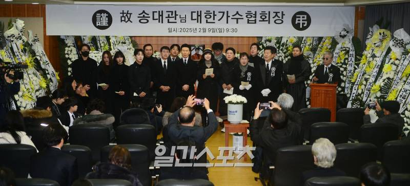 고송대관의영결식이9일서울종로구서울대학교병원장례식장에서엄수됐다.태진아,설운도등후배가수들이조사해뜰날을부르고있다.서병수기자[email protected]/2025.02.09/트롯가수고(故)송대관의동료들의배웅을받으며영면에들었다.9일오전9시30분서울종로구대학로서울대학교병원장례식장에서는고송대관의영결식이치러졌다.대한가수협회장으로진행된이날영결식에는이자연대한가수협회회장과가수태진아,강진,설운도,김창열,한지일,김성환,이숙,박상철등이참석했다.영결식은고인을향한묵념과배우겸가수김성환의약력소개로시작됐다.이어생전고인과막역한사이였던후배가수태진아가추도사를낭독했다.태진아는“형은항상제게멘토였다.‘형가는길만따라오면너는다잘되는것이여.나가는곳만따라와’라고하셨던분”이라고고인을기억했다.태진아는“3일동안밥을안먹었다.술로배를채우면서형님이하늘나라가서사시면제가방송하고이러는것도큰재미가없을것같다고생각했다”며“새해인사를나누면서‘오랜만에우리라이벌디너쇼나한번하자’고하니까형이‘좋지.꼭하자’라고답했다.돌아가시기전날에도공연순서와곡목록을정하고있었다”고털어놨다.연신눈물을흘리던태진아는“좋은곳에서편안하게잘계시고제가갈수있는좋은자리를만들어달라.그럼제가언젠가형님곁으로가겠다”고말했다.끝으로그는“형잘가.영원한나의라이벌이여”라고덧붙이며고인의영정을향해손을흔들었다.고송대관의영결식이9일서울종로구서울대학교병원장례식장에서엄수됐다.가수태진아가추도사를하고있다.서병수기자[email protected]/2025.02.09/이후이자연대한가수협회장의조사와강진,설운도의추도사낭독이이어졌다.설운도는“가수는결국무대에서시작해무대에서생을마감한다.마지막까지하고싶은일을웃으면서하시다가셨기에마음은아프지만,위안이된다.형님빈자리를사랑으로채워주기를바란다”며고인을기렸다.태진아,설운도,강진,김수찬등후배들은고인의대표곡‘해뜰날’을조가로합창했다.특히김수찬은‘해뜰날’모창과성대모사로고인을추억했다.11시부터거행된발인에도수많은가요선후배가자리해고인과작별인사를나눴다.운구는태진아,강진,설운도,박상철,김창열,김수찬,양지원등이맡았다.고인은서울추모공원을거쳐경기도안성유토피아추모관에서영면에든다.앞서고송대관은지난7일오전10시서울종로구서울대병원에서심장마비로사망했다.전날컨디션난조로서울대병원응급실을찾았던고인은응급실로이송돼치료를받았으나끝내숨을거뒀다.소속사에따르면고인은생전담도암판정을받고투병했으며위절제술을받는등지병을앓았다.1967년‘인정많은아저씨’로데뷔한고송대관은그간‘해뜰날’,‘유행가’,‘네박자’등다수의히트곡을남겼으며,태진아,설운도,고현철과‘트롯사대천왕’으로불렸다.한편고인의생전마지막모습은오는2월16일,3월2일방송되는KBS1‘전국노래자랑’에서볼수있다.고인은지난해10월해당녹화에참여했다.장주연기자[email protected]©일간스포츠.무단전재및재배포금지.