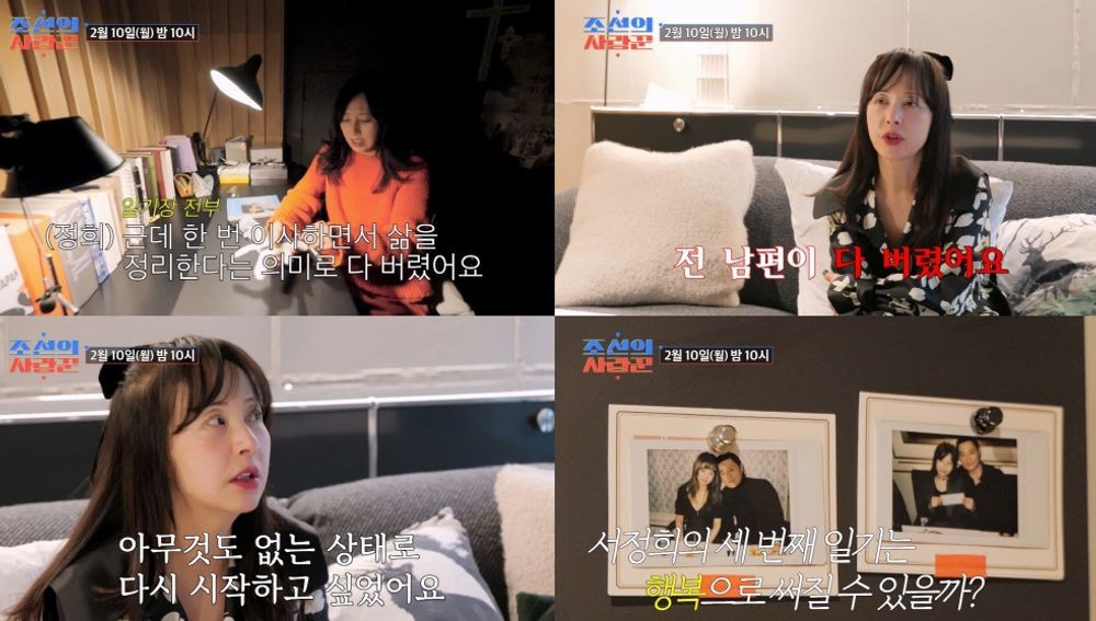 [TV리포트=하수나기자]‘조선의사랑꾼’서정희가전남편인서세원과의결혼생활이힘들었다며과거의아픔을고백한다.10일TV조선‘조선의사랑꾼’에'6세연하'건축가남자친구와함께새로운사랑꾼으로합류를예고한서정희는"(일기장전부를)한번이사하면서삶을정리한다는의미로다버렸다"라고조심스럽게고백했다.그는"어렸을때부터저는일기를꼭썼다.아주개인적인내용이었는데..."라며"제가결혼생활할때가지고있었던모든물건을전남편이다버렸다.제추억이었던일기장과노트를포함해아무것도없었다"고눈시울을붉혔다.하지만그랬던서정희도결혼생활중다시일기를작성하기시작했다.그는"몰래...결혼생활하면서힘드니까,일기를다시쓰기시작했다"면서"일기의내용은'비참해,외로워,슬퍼'..."라고눈물로작성했던나날을돌아봤다.그는그일기장들에대해서는"이혼하면서다불태웠다.저의과거결혼생활이너무싫었기때문에청산하고싶었다.아무것도없이다시시작하고싶었다"고담담하게밝혔다.그리고"그다음부터는개인적인일기는안쓰게되었다"고전해안타까움을자아냈다.‘조선의사랑꾼’은2월10일(월)오후10시에방송된다.하수나기자[email protected]/사진제공=TVCHOSUN‘조선의사랑꾼’Copyright©TV리포트.무단전재및재배포금지