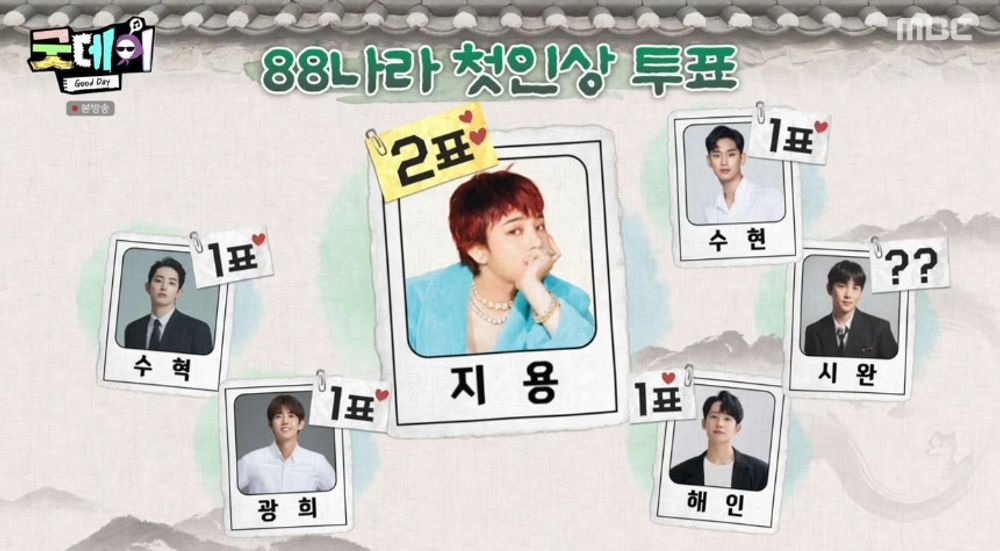 [스타뉴스|이승훈기자]/사진=MBC'굿데이'/사진=MBC'굿데이'보이그룹빅뱅멤버지드래곤(본명권지용)이가장호감가는친구로배우김수현을손꼽았다.23일오후방송된MBC예능'굿데이'에서는'나는솔로'콘셉트로88나라에모인지드래곤,김수현,이수혁,임시완,황광희,정해인등88스타들의이야기가그려졌다.앞서지드래곤은서울의한LP바에서황정민을만났다.그는"나에게좋은말씀도많이해주시고여러가지로깨달음을주는사람이다.내가좋아하는서글서글한동네형이다.개인적으로친분이있었다.콘서트에도와주시고롤모델처럼좋은자극을계속주시는분이다.내가팬이다"라며황정민을향해남다른팬심을드러냈다./사진=MBC'굿데이'황정민역시지드래곤에게무한애정을쏟았다.그는차기작을묻는지드래곤의물음에"지금은없고작품선택한건GD형님이하는그작품이다.슬그머니숟가락올리려고한다"라고대답해지드래곤을폭소케만들었다.지드래곤은어디서도공개한적없었던'삐딱하게'작업비하인드를공개했다."비트를만들어놓고흥얼거리는데가사가떠오르지가않았다"는지드래곤은"에너지를표현하고싶었는데왜갑자기강산에선배의'삐딱하게'가딱떠올랐다.왜떠올랐는지도모르겠다.'오늘밤은삐딱하게?'이런식으로영감을받았다.이걸어디서말할기회도없었다.선배들옛날곡부터듣고하니까그게진짜짱이다"라고이야기했다./사진=MBC'굿데이''굿데이'는'나는솔로'콘셉트를따라한'88나라'를개최,김수현과정해인,임시완,이수혁,황광희를초대했다.이를본데프콘은"지드래곤은내가동묘에서'영철'로했다.김수현은가장먼저태어났다.대화를이끌고판을잘깔아주는맏형느낌이어서'영수'다.임시완은귀엽고성격도둥글둥글해서'영자'다'.이수혁은피지컬이넘사벽이어서'영호',정해인은무조건'옥순'이다.내눈엔너무예쁘다.광희는짝사랑에가슴앓이하는'광수'로가야한다"라며멤버들에게'나솔네임'을지어줬다.이어진자기소개시간에서정해인은"이공간그리고앞으로있을지용이가만든프로젝트에서는배우보다는조금더인간정해인,사람정해인으로참여해보고싶은마음이있다.바쁜사람들끼리모인게소중한인연이니까잘간직해보자"라고말했다.김수현은"이런자리에서있는게말이안되고상상도못하는성격이다.원체내성적이고방어적이고폐쇄적이어서2024년이아니었으면이렇게흔쾌히콜!하지않았을텐데올해많이성격이바뀌었다.나이를먹은거다.금방아저씨다.성격이바뀐덕분에이프로젝트에참여할수있게돼서영광이다.데뷔한지이제18년차배우다.데뷔하고나서보니까동갑내기들을만나는게진짜쉬운일이아니다.그래서이자리에뜻깊고의미있게잘됐으면좋겠다"라며애정을드러냈다./사진=MBC'굿데이'첫인상투표도이어졌다.결과는지드래곤2표,황광희와김수현,이수혁,정해인은1표,임시완은0표를받았다.임시완은황광희,김수현은이수혁,이수혁은정해인,정해인은지드래곤,지드래곤은김수현,황광희는지드래곤을지목했다.임시완이해당결과를듣고섭섭해하자지드래곤은"나는솔직히시완이다"라며임시완을달랬지만,임시완은"지금주면무슨의미냐"라고맞받아쳐웃음을자아냈다.'굿데이'는지드래곤이프로듀서가되어한해를빛낸다양한분야의인물들과함께그해를기록할만한노래를만들어내는음악프로젝트프로그램이다.매주일요일오후9시10분에방송된다.이승훈기자[email protected]©스타뉴스&starnewskorea.com,무단전재및재배포금지