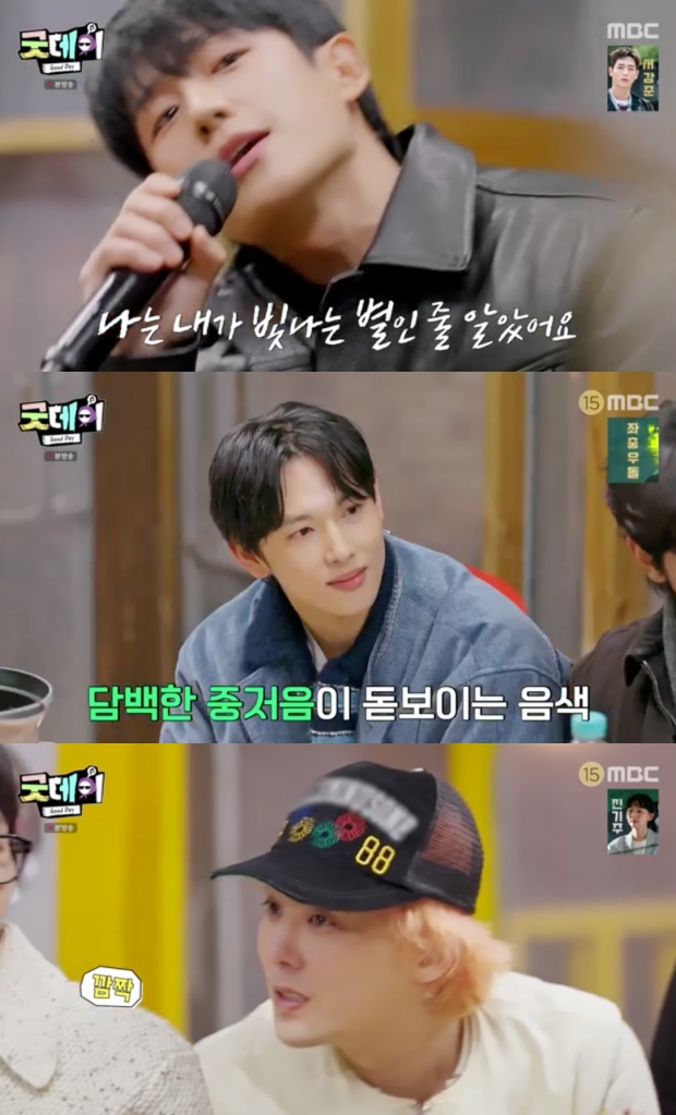 굿데이[티브이데일리최하나기자]‘굿데이(GoodDay)’정해인의노래실력이공개됐다.2일밤방송된MBC예능프로그램‘굿데이(GoodDay)’3회에서는지드래곤을중심으로배우김수현,이수혁,임시완,황광희,정해인까지‘나는솔로’콘셉트로한자리에모인88스타들의두번째이야기가공개됐다.이날정해인은‘나는반딧불’을부르며노래실력을뽐냈다.‘88즈’들은정해인의노래를들으며놀란모습을보이기도했다.정해인의노래가끝난뒤데프콘은“홍대에서버스킹한적없느냐”고말하며정해인의노래에감명받은모습을보였다.또한황광희는“벌레지만빛난다는가사가좋았다.내이야기같았다”며극찬했다.[티브이데일리최하나기자[email protected]/사진=MBC‘굿데이’]굿데이[Copyrightⓒ*세계속에新한류를*연예전문온라인미디어티브이데일리(www.tvdaily.co.kr)/무단전재및재배포금지]Copyright©티브이데일리.무단전재및재배포금지.