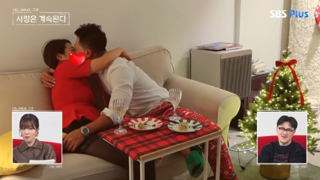ENA,SBSPlus‘나는SOLO,그후사랑은계속된다(나솔사계)’캡처ENA,SBSPlus‘나는SOLO,그후사랑은계속된다(나솔사계)’캡처[뉴스엔서유나기자]22기정숙(가명)과10기상철(가명)이뜨거운연애를보여줬다.2월27일방송된ENA,SBSPlus예능'나는SOLO,그후사랑은계속된다(나솔사계)'102회에서는'나는솔로'출연이후현실커플이된10기상철,22기정숙의근황이공개됐다.이날미국에서한국으로들어온상철은정숙의집에처음으로놀러갔다.정숙과술한잔을기울이던그는정숙이"왜은근히봐?"라고묻자"입술이맛있게보여서"라고답했다.상철은부끄러워하는정숙에"우리아기44살이잖나.부끄러워하지말라"며입을맞췄다.이후로도정숙과진득하게눈맞춤을한상철은급기야정숙을껴안고진한키스를나눴다.손으로는엉덩이쪽을토닥였다.너무진한스킨십에데프콘은"이정도면스태프들이빠져줘야한다"고말했다.이어"20대대학생연애처럼나이와상관없이정말표현이,서로간에두텁지않냐.오히려보기좋다"며두사람의불붙은연애를응원했다.하지만윤보미는이후로도키스장면이나오자"아니,뽀뽀를계속하시네"라며민망함을감추지못했다.뉴스엔서유나stranger77@기사제보및보도자료[email protected]ⓒ뉴스엔.무단전재&재배포금지Copyright©뉴스엔.무단전재및재배포금지.