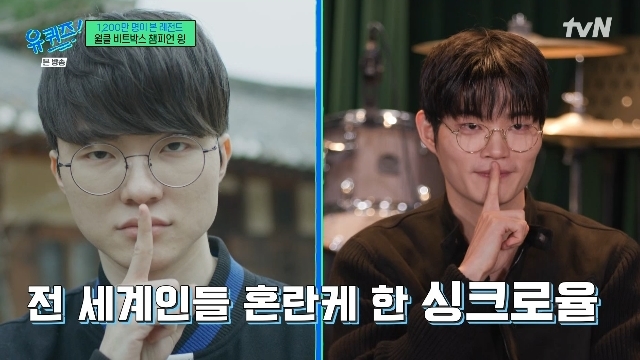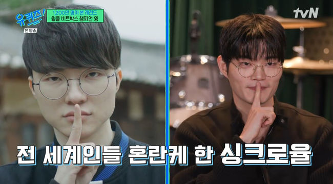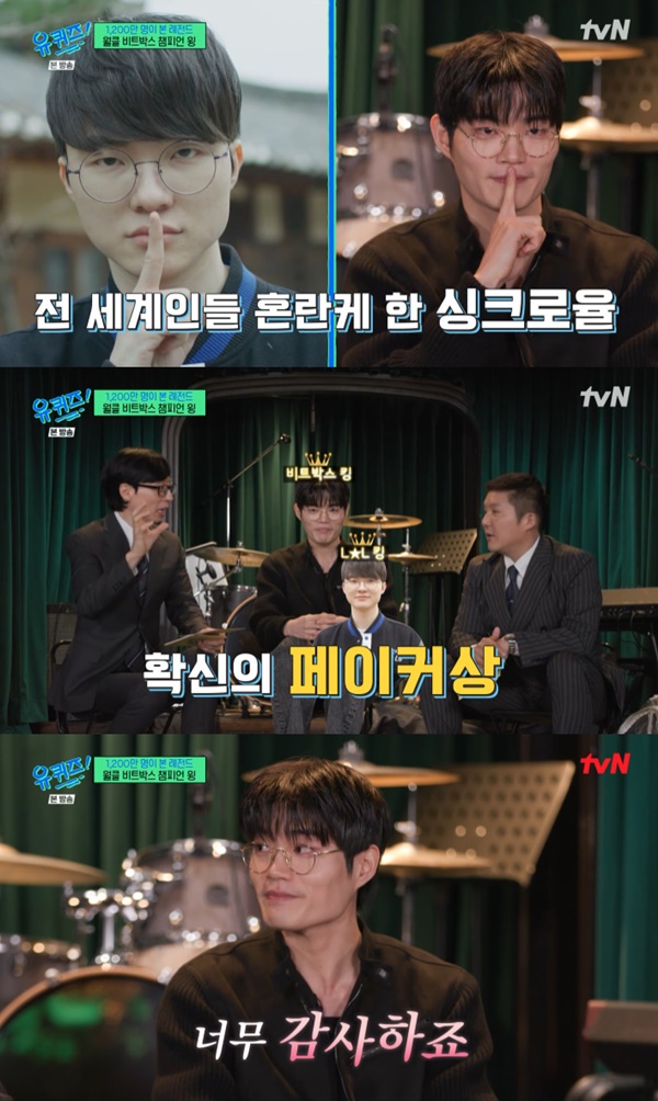 유퀴즈비트박서윙/사진=tvN[스포츠투데이서지현기자]'유퀴즈온더블럭'윙이페이커닮은꼴을언급했다.19일저녁8시45분방송된tvN'유퀴즈온더블럭'(이하'유퀴즈')285회에서는1200만뷰영상의주인공비트박서윙(WING·김건호)이출연했다.이날MC유재석은비트박서윙의영상과관련해외국인들의'페이커닮은꼴'반응을언급했다.MC유재석은"해외에서도'페이커랑닮은사람은업계톱이되냐'는반응이있었다.페이커상이'킹(King)상'이라고하더라"라고말했다.이에대해윙은"그런얘기되게많이들었다.사실페이커는자타공인톱이지않냐.오히려그런이미지로봐주셔서낙수효과를받는다.너무감사하다"고말했다.[스포츠투데이서지현기자[email protected]]Copyright©스포츠투데이.무단전재및재배포금지.