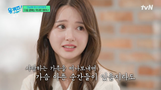 [스타뉴스|김노을기자]/사진=tvN방송화면배우남보라가동생들로부터편지를받고눈물을흘렸다.26일방송된tvN예능프로그램'유퀴즈온더블럭'에는13남매대가족장녀인남보라와그의가족들이동반출연했다.이날남보라의일곱째동생남세빈은남보라를위해정성껏쓴편지를읊었다.남세빈은"언니는늘가족을먼저생각하는따뜻한사람이다.언니는다음생에도13남매로태어날거냐.만약누군가내게그런질문을한다면나는망설임없이'예스'(Yes)라고대답할것"이라고운을뗐다./사진=tvN방송화면이어"우리가어린시절힘들게자랐지만그순간이있었기에지금우리가족이있다고느낀다"며"다음생에는내가일곱번째로태어나서언니,오빠들의옷을물려입고찬물로샤워하던추운시절이있어도,라면5개끓여서10명이나눠먹던그배고픈시절이있어도,사랑하는가족을떠나보내며가슴아픈순간들이있을지라도나는그모든순간들을가족과함께겪으며행복하게살것"이라며눈시울을붉혔다.남보라또한세상을떠난동생이언급되자끝내눈물을흘렸다.앞서남보라는지난2015년12월동생을잃었으며사인은알려지지않았다.남세빈은그러면서"그때는언니가장녀로태어나지말고막내로태어나서보탬을많이받았으면좋겠다.앞으로모든날들이언니에게행복하고웃음이가득한시간들로채워지길기도하겠다"고남보라에대한애틋한마음을전했다./사진=tvN방송화면남세빈의편지에남보라는"감동이다"고말하며미소를지었다.스튜디오는눈물바다가됐다.이후남보라는제작진과인터뷰에서"어릴때풍족한형편이아니었다.수도,가스,전기세개가다끊겨서촛불을켜고지낸적도있다.가스버너로물끓여서세수하고학교에가기도하고그랬다"고힘들었던지난날을떠올렸다.이어"그런데누구하나불평한사람이없었다.그때힘들긴했는데잘버텨줘서지금우리가족이단단하게뭉친게아닌가싶다"며웃어보였다.김노을기자[email protected]©스타뉴스&starnewskorea.com,무단전재및재배포금지