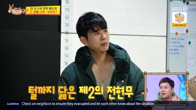KBS2TV‘사장님귀는당나귀귀’캡처KBS2TV‘사장님귀는당나귀귀’캡처[뉴스엔서유나기자]김진웅아나운서의방송인전현무를똑닮은수북한가슴털이충격을자아냈다.3월30일방송된KBS2TV예능'사장님귀는당나귀귀'(이하'사당귀')299회에서는엄지인이김진웅밀착멘토링에나섰다.이날아나운서실에출근한김진웅은소파에누워있다가벌떡일어나자신을반기는엄지인에깜짝놀랐다.엄지인은'굿모닝대한민국'생방송을앞둔김진웅을봐주러왔다며홍주연에이은두번째밀착멘토링을선언했다.그러면서엄지인은머리카락을안말린채로온김진웅의상태를지적했는데,곧패딩점퍼지퍼를내린김진웅에진저리를치며고개를돌렸다.지퍼를내리니가슴털이수북했던것.스튜디오까지경악하는가운데전현무는"너나랑같은과구나?왜털까지닮아"라며반가워했다.김숙은"제2의현무네"라고평했다.엄지인이"전현무,전현무하다가가슴털까지따라하는거냐뭐냐"고하자김진웅은"제가땀이좀많아서스타일리스트가준비해준옷에묻을까봐(이렇게입고다닌다)"고밝혔다.하지만엄지인은"아오눈버리겠다.못처다보겠다"며그의가슴털을감당하기어려워했다.뉴스엔서유나stranger77@기사제보및보도자료[email protected]ⓒ뉴스엔.무단전재&재배포금지Copyright©뉴스엔.무단전재및재배포금지.