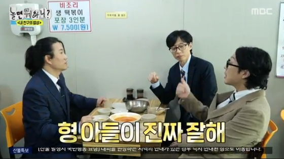 (엑스포츠뉴스이유림기자)'놀면뭐하니?'에서유재석의아들이언급됐다.29일방송된MBC‘놀면뭐하니?’는‘내친구의밥상’편으로꾸며지는가운데,임우일의‘無지출대접’을받으며예측불가맛집코스를즐기는유재석과하하의모습이그려졌다.이날유재석,하하,임우일이'직장인콘셉트'로변신해맛집탐방에나섰다.임우일이안내한20년전통의떡볶이집에서유재석은현재물가에비해저렴한가격표에놀라움을표했다.김밥3,000원,순대3,500원,라볶이4,500원,쫄면4,000원등가성비높은메뉴들이눈길을끌었다.라볶이를맛본유재석은감탄하며흡입하듯먹방을선보였다.어묵국물로입가심을한유재석이리필을위해두리번거리자,이를포착한임우일은"저주시면된다"며즉시일어나어묵국물을리필해주는센스를발휘했다.유재석은"후배가있으니까좋다"며만족감을드러냈고,하하는"우리가가도된다.너도먹으라"고배려를표했다.이어유재석이단무지를찾자임우일은또다시빠른행동력을보여웃음을자아냈다.유재석은"역시코미디언직속후배라엉덩이를못떼게만든다"며칭찬했다.하하가"물좀떠오겠다"고일어서는척을하자,단무지를가져오던임우일은즉시방향을바꿔물을가지러움직이는순발력을보였다.그런가하면,세사람은식사중유재석의아들에관한대화도오갔다.하하는"우리도련님이공부를잘한다.엄마닮아서.엄마연세대나왔다.기가막히다.수재다"고전했다.이에유재석은"엄마연대를왜얘기하냐"고발끈했고,하하의"아니야?"라는반문에"맞다"고인정했다.사진=MBC방송화면이유림기자[email protected]©엑스포츠뉴스.무단전재및재배포금지.