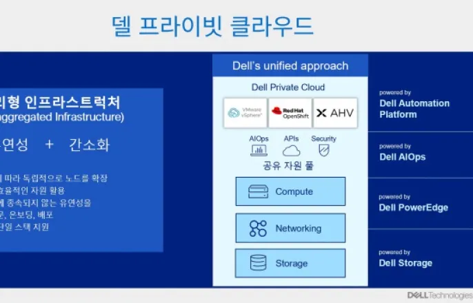 [디지털데일리이안나기자]델테크놀로지스가분리형인프라구성을적용한‘델프라이빗클라우드’에서‘뉴타닉스AHV’지원을시작했다고23일밝혔다.기업과기관은뉴타닉스AHV와델외장형스토리지를결합해서버와스토리지를독립적으로확장할수있다.멀티하이퍼바이저환경에서기존관리도구와자동화기반라이프사이클관리체계도유지할수있다.프라이빗클라우드확산에따라공급업체종속을피하려는수요가늘고있다.델은멀티하이퍼바이저전략을선택하는비중이높아지고있으며플랫폼선택보다확장가능한인프라설계가중요해지고있다고설명했다.하이퍼컨버지드인프라(HCI)는전통적3계층아키텍처대비관리복잡성을낮추는역할을해왔다.최근에는워크로드다양성이커지면서기존하드웨어재사용과운영연속성유지요구가강조되고있다.델프라이빗클라우드는운영단순화와유연한아키텍처를중심으로설계됐다.핵심소프트웨어인‘델오토메이션플랫폼’은구축단계부터운영과라이프사이클관리까지자동화를제공한다.델파워엣지서버와스토리지전반에서일관된운영환경도지원한다.이를통해서버와스토리지를분리확장하고워크로드에맞춰하이퍼바이저를선택할수있다.델프라이빗클라우드는기존VM웨어와레드햇오픈시프트지원에이어뉴타닉스를추가했다.델파워플렉스는뉴타닉스를지원하며여름에는델파워스토어통합도예정돼있다.고객은워크로드요구에따라스토리지를선택할수있다.델은분리형인프라전환이비용구조와투자전략에영향을준다고밝혔다.뉴타닉스지원을통해멀티하이퍼바이저환경에서인프라설계유연성과비용효율을확보할수있다는설명이다.뉴타닉스AHV를적용한델프라이빗클라우드는워크로드특성에맞는리소스구성을지원한다.프리즘UI등기존관리도구를활용해운영연속성을유지할수있다.델오토메이션플랫폼은구축과라이프사이클관리를자동화한다.기존델인프라도재활용할수있어단계적확장이가능하다.델프라이빗클라우드는VM웨어레드햇뉴타닉스를모두지원한다.기업은워크로드특성에따라플랫폼을선택하고인프라투자시점을조정할수있다.김경진한국델테크놀로지스총괄사장은“비즈니스가진화하는속도에맞춰인프라도함께진화해야한다.델은아직정의되지않은미래까지대비할수있는유연한프라이빗클라우드기반을제시함으로써새로운패러다임을이끌어가고있다”고말했다.Copyright©디지털데일리.Allrightsreserved.무단전재및재배포금지.