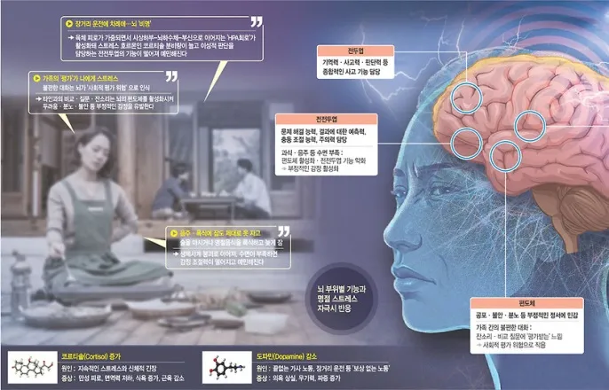 ■‘뇌과부하’작동방식과해소방법“취업했니?”“결혼은?”등가족에게받는‘사회적평가’뇌가위협신호로신속감지‘코르티솔’호르몬분비촉진사소한말도크게받아들여폭식·음주·수면변화겹쳐생체리듬교란이어지기도충분한휴식·걷기등도움“요즘만나는사람은있니”“뉴스에서도‘쉬었음청년’이야기가나오던데꼭네이야기같더라”“아이계획은있니”….지난주설연휴에들었던말들이아직도귓가에울리는것만같다.귀성길교통체증,명절음식준비,오랜만에만난가족과의불편한대화를보내고맞은주말은쏜살같이지나간다.전쟁같은명절을보내고난뒤면심신은평소보다피로하고예민한상태다.“나만유난인가”라는자책이따라붙다가도거울앞에서면푸석한피부와짙은다크서클이반긴다.명절스트레스는정말내마음가짐이부족해서일까?사실은‘뇌가작동하는방식’과맞닿아있다.핵심은한가지사건이아니라동시에몰려오는부담이다.가족앞에서사회적역할을평가받는다는부담,일정관리와각종집안일로인한과부하,이동·음주·폭식으로흔들리는생체리듬이복합적으로얽힌결과다.뇌는이런복합신호를처리하는과정에서감정조절기능이흔들리고에너지를빠르게소모한다.명절에힘든것은의지가약해서가아니라뇌가‘과부하’상태에들어갔기때문일수있다.명절은이런조건들이한꺼번에겹치기쉬운시간이다.역할과기대가충돌하고,수면과리듬이흔들리면뇌는쉽게과부하상태에들어간다.압박이과하면뇌는이를위기상황으로인식하고코르티솔을올려긴장상태에빠지고수면이무너지면감정조절이더어려워진다.명절이아니더라도누군가의사회적판단에상시노출되거나잦은음주·야식을즐기고불규칙한수면이습관화된사람이라면심신이극도의스트레스에놓일가능성이매우크다.◇가족의‘평가’가나에게는스트레스=뇌는‘사회적평가’에대해경계한다.갈등은대개큰사건에서시작되지않는다.“요즘은뭐하니”“결혼은언제하니”“왜이렇게말랐니(살쪘니)”같은질문이반복되다가어느순간감정이확치솟는다.사람은타인의평가를받을때위협신호를빠르게감지한다.구체적으로는‘내가수행한과제가타인으로부터부정적으로평가될가능성이있을때’이미스트레스호르몬인코르티솔이증가하기시작한다.미국캘리포니아대의샐리디커슨교수에따르면이같은‘사회평가적위협’은인간의뇌가받는가장강한스트레스경험중하나로,실제부정적평가가발생하기이전에이미위협상황을감지한뇌가작동하기시작한다.뇌속편도체가위험신호를판단하면몸은즉각긴장상태에들어간다.편도체가‘위험’을감지하면심박수가빨라지고호흡이가빠지며,스트레스반응을이끄는HPA(시상하부-뇌하수체-부신)축이가동돼코르티솔분비가늘수있다.코르티솔은단기적으로각성수준을끌어올려대응을돕지만긴장이누적되면사소한말도더크게받아들이게만든다.문제는가족의‘평가’가낯선타인의평가보다더강력하게작동하기쉽다는점이다.오랜관계에서는말의표면적의미뿐아니라과거경험,기대와실망,역할갈등이함께떠오르기때문이다.당장의갈등이마무리되고사과나해명이오가더라도뇌는이미위협신호를처리한뒤일때가많다.이때이성적판단과충동억제를담당하는전전두엽의기능은스트레스와피로에취약해진다.말을걸러내는브레이크가약해진상태에서평가신호가들어오면,평소라면넘길말에도반응이과해지기쉽다.◇도파민고갈되고잠도못자=스트레스가지속되면‘보상체계’도흔들린다.해야할일이끝없이이어지고노력에비해즉각적인보상이불분명한상황에서는동기와의욕을조절하는뇌의보상신호가둔화할수있다.운전과대기,장보기와조리,설거지와정리같은일은끝이명확하지않다.뇌는노력대비보상이적다고느끼면동기와의욕을조절하는도파민등호르몬의균형이흔들리기쉽다.기대했던보상이돌아오지않을때도파민신호가낮아지는‘보상예측오차’반응이나타나는것이다.누락이계속되고만성화될수록뇌내도파민보상신호가약해질가능성이크다.활력이떨어지고같은자극에도즐거움이덜느껴지며짜증과무기력이늘어난다.여기에수면패턴교란이겹치면상황은더악화된다.늦은취침과이른기상,길어진낮잠,이동으로단절된수면은생체리듬을흔든다.폭식과음주도수면의질을떨어뜨리는요인이다.수면이부족하면전전두엽의조절능력이더떨어지고,편도체의반응은더커진다.즉감정은더커지고제어는더약해지는것이다.평소에는괜찮던농담이상처로느껴지고작은오해가다툼으로번지기도한다.피곤한데잠은안오는상태가이어진다면이는의지문제가아니라생체리듬이교란된결과일가능성이있다.◇홀로회복하는시간필요해=그렇다면해법은무엇일까.‘참아라’라는조언은뇌과학적으로도실효성이낮다.이미뇌가위협신호를처리한뒤에는인내심을끌어다쓰는것자체가비용이크다.대신회복에집중하는것이현실적이다.가장기본은수면이다.일정과자극이늘어나는시기,예컨대명절에는평소보다가능하다면잠을30분이라도더확보하는편이낫다.잠이회복되면전전두엽의조절능력도함께돌아와과도한반응이줄어들수있다.짧은걷기도도움이된다.10∼15분만이라도밖을걸으면긴장