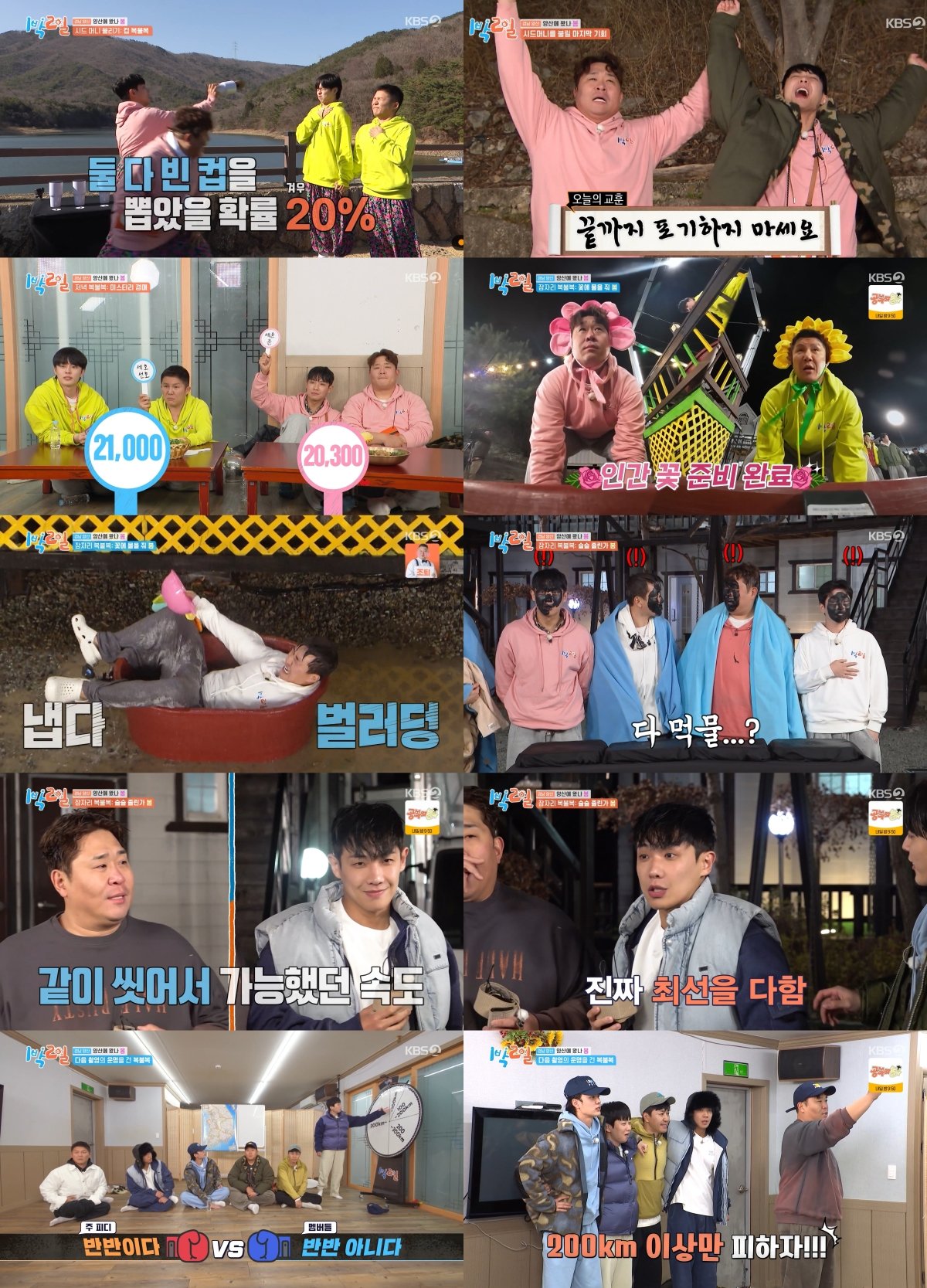 [동아닷컴][사진=KBS2TV‘1박2일시즌4’방송캡처]‘1박2일’멤버들의화끈하면서도처절했던봄맞이여행이마무리됐다.지난6일KBS2TV예능프로그램‘1박2일시즌4’(이하‘1박2일’)에서는경상남도양산시로여행을떠난여섯멤버의‘양산에왔나봄’두번째이야기가그려졌다.이날시청률은7.6%(이하닐슨코리아집계,전국기준)로동시간대1위를기록했다.멤버들이복불복을통해다음여행의콘셉트를결정하고협상을끝내는장면은최고시청률10.9%까지치솟았다.6개의물컵중2개의빈컵을동시에선택하면2배의시드머니를획득할수있는미션이펼쳐진가운데,문세윤&이준팀은첫도전에무려절반의시드머니를베팅했음에도결과는실패로돌아갔다.두사람은남아있는모든씨앗을올인하며한방을노렸지만이마저도실패로끝났다.전재산을탕진한문세윤과이준은다른멤버들이휴식을취할때미나리손질작업을하며10,000씨앗을획득했다.이어시드머니를추가할수있는마지막기회‘씨앗대축제’가펼쳐졌고,멤버들은‘복불복칼뽑기’,‘제기차기’,‘다트’에도전하며시드머니증식에나섰다.문세윤&이준팀은가장적은돈으로게임에참여했지만,제기차기와다트에서하드캐리를펼친문세윤의활약을앞세워시드머니를61,000씨앗으로대폭늘렸다.최하위에서1위로단숨에뛰어오른두사람은기념사진까지촬영하며대역전극의기쁨을만끽했다.‘1박2일’팀은이날모은시드머니로저녁식사경매에나섰다.베일에가려진여덟가지의음식메뉴가순차적으로등장할때마다멤버들은열띤눈치싸움을펼쳤고,과감하게경매에참여한이준의활약을바탕으로문세윤&이준팀은먹음직스러운메인메뉴들을획득했다.반면조세호&유선호팀은튀김,고수,메추리알을얻는데그치며소박한저녁식사를했다.잠자리복불복에서도2:2:2팀전은이어졌다.치열한수중난타전이펼쳐진첫번째게임에서는조세호&유선호팀이문세윤&이준팀과김종민&딘딘팀을상대로연승을거두며실내취침을먼저확정했다.첫게임을마치고얼굴에먹물범벅이된네사람은상대팀보다먼저깨끗하게씻고나와야승리하는두번째게임에돌입했다.문세윤&이준팀은함께샤워를하며시간을대폭단축했고,특히이준은급한마음에속옷까지생략하는등실내취침을향한집념을불태웠다.결국문세윤과이준이김종민,딘딘보다먼저밖으로나오면서두번째게임의승리자가됐다.이준은“우리진짜처절했어”라고소감을밝히며스스로의힘으로쟁취한실내취침에대만족했다.다음날아침멤버들은돌림판복불복으로다음여행의콘셉트가결정되는기상미션에참여했다.총4개주제의복불복을진행한결과‘1박2일’팀은서울에서300km이상떨어진바다로가서낙오없이한끼식사는포식하는여행을떠나게됐다.다음주서울에서300km이상떨어진바다로떠나게된멤버들이또어떤유쾌한케미를만들어낼지기대감이높아지고있다.‘1박2일시즌4’는매주일요일저녁6시10분에방송된다.전효진동아닷컴기자[email protected]©스포츠동아.무단전재및재배포금지.