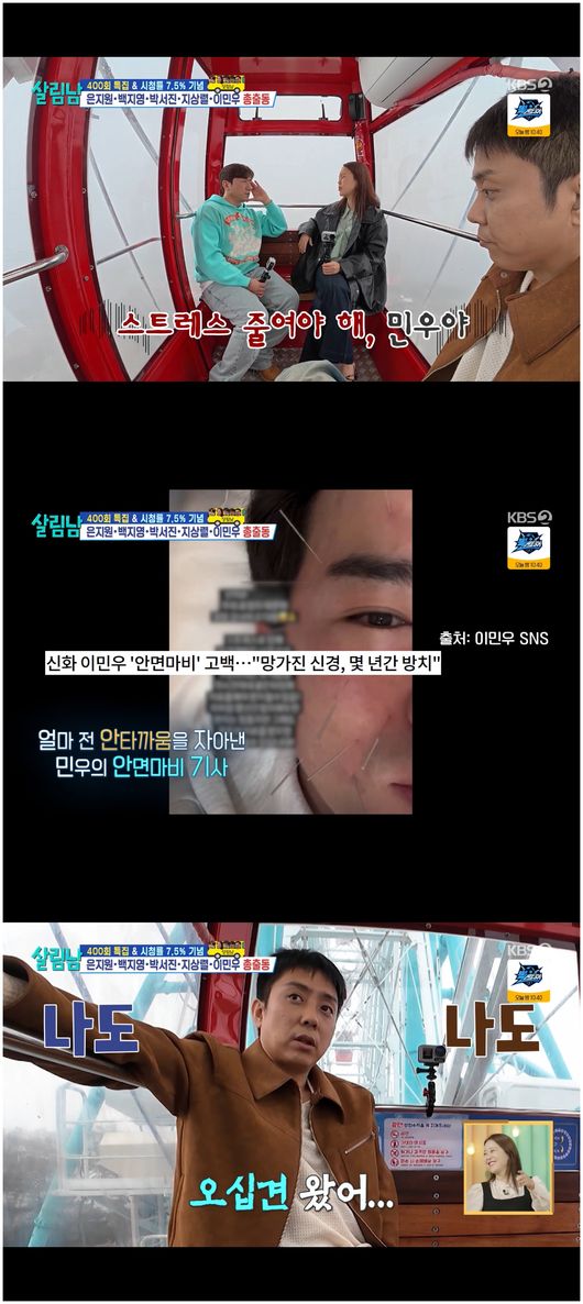 [OSEN=오세진기자]'살림남2'백지영이동료가수이민우에대한걱정으로근심했다.12일방영된KBS2TV예능'살림남2'에서는400회기념으로삼천포로향한백지영,이민우,은지원,박서진,지상렬의모습이그려졌다.이곳은박서진의고향이었다.가이드를자처한박서진은알찬계획을세운채가이드마이크까지차고야무지게설명하는모습을보였다.사천시명물인관람차에도착했다.박서진은인천월미도에서지상렬에게당한대로지상렬만남긴채관람차에서쑥빠졌다.백지영,이민우,은지원은함께탄채그모습을보고깔깔웃었다.문득백지영은“이민우너는건강이어떻게된거냐”라며물었다.이민우는“나도그럴줄몰랐다.2018년에왼쪽이좀떨리다가결국구안와사판정을받았다”라고말해모두를깜짝놀라게했다.백지영은“스트레스를줄여야해.스트레스가너무많은가봐”라며조언했다.이민우는“누나는아픈데없어?”라며되물었다.백지영은“나는오십견왔어”라고말했고,은지원은“나도오십견왔어”라며공감했다./[email protected][사진]KBS2TV예능'살림남2'방송화면캡처Copyright©OSEN.무단전재및재배포금지.