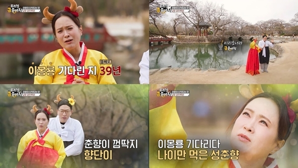 가수김정연이성춘향으로분했다.16일방송된KBS1‘우리집금송아지(이하‘금송아지)’에는전북특별자치도남원시산내면원천마을찾은김정연과정범균의모습이담겼다.국악도시남원을찾은김정연은노란저고리와붉은치마가곱게어울리는성춘향으로,정범균은그뒤를따르는향단이로분해등장부터시청자들의웃음을자아냈다.특히김정연은춘향전의판소리중‘사랑가’첫소절인“이리오너라업고놀자”를“이리오너라‘금송아지’”로개사해부르며춘향이캐릭터에이입한모습을보였다.짧은가락에도돋보이는탄탄하게이어지는김정연의목소리에서는숨길수없는가수의내공이돋보이기도했다.16일방송된KBS1‘우리집금송아지(이하‘금송아지)’에는전북특별자치도남원시산내면원천마을찾은김정연과정범균의모습이담겼다정범균은그런김정연을연거푸“마님”이라불러화를돋궜다.김정연은“아직시집도안갔는데마님이뭐냐”라며정범균을지적한뒤“내가우리낭군님을기다린지벌써39년이다.16살에만나시간이이렇게흘렀지만언젠가는올거다”라며지고지순한모습을보였고,그런김정연에정범균은“금송아지다섯개를모으면이몽룡을만날수있다”고말해금송아지를찾으러출발했다.원천마을을돌며다섯점의감정품을모두만나본뒤김정연이“그런데이몽룡은어디있냐”고두리번거리자,잠시뜸을들인정범균은향단이의가발을벗으며“여기있다.제가몽룡이다”라고답해마지막까지시청자들에게웃음을안겼다.김정연은“39년째암행어사시험에떨어진것같다”고한탄했다.한편‘사랑가’로시청자들에게다시한번노래실력을선보인김정연은지난발라드곡‘이별후애(愛)’로활발한활동을이어가고있다.[금빛나MK스포츠기자][ⓒMK스포츠,무단전재및재배포금지]Copyright©MK스포츠.무단전재및재배포금지.