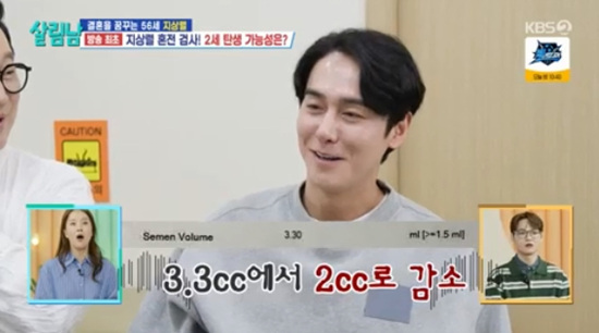 (엑스포츠뉴스원민순기자)'돌싱'김상혁이정자수감소에충격받았다.26일방송된KBS2TV'살림하는남자들시즌2'에서는김상혁이비뇨의학과를찾아검사를받는모습이전파를탔다.이날김상혁은지상렬,김용명에게6년전받았다는활력검사결과지를보여줬다.지상렬은결과지가모두영어로되어있는것을보고김상혁에게설명해달라고했다.김상혁은번역기를돌린후에야자신의6년전정자수가2억5천만마리였다는것을확인하고는의기양양해했다.지상렬,김용명,김상혁은나란히비뇨의학과로향해본격적인검사에앞서의사를만났다.김용명은자신보다어린김상혁이견제됐는지김상혁이이혼한사실을언급하며이혼이정력에영향을미치는지궁금하다고했다.의사는"심각한영향끼친다.연구에따르면배우자와의이별이인생에서느끼는스트레스최상위라고한다"고설명했다.모든검사를마친지상렬,김용명,김상혁은진료실로들어가결과를들었다.의사는김용명의남성호르몬수치에대해611로상당히양호한수치라고말했다.김용명은벌떡일어나더니의사앞에서기쁨의세리머니를선보였다.의사는"그런데남성호르몬수치가높으면탈모의위험성이올라갈수있다"는점을알려줬다.의사는김용명의활력검사결과의경우양이약간적었는데문제가될정도는아니라고했다.김용명은현재정자수도좋고운동성과형태도정상이라2세계획에전혀지장이없다는얘기도들으며걱정과달리완벽한결과에안도했다.의사는김상혁의결과공개를앞두고"최근에그런일이있어서그런지양은많지않았다"고운을뗐다.김상혁은남성호르몬수치가550으로조금낮게나왔다.의사는마리수가김용명과비교했을때1천만마리차이가난다고했다.김상혁은6년전과달라진결과에망연자실했다.은지원은스튜디오에서김상혁의남성호르몬수치를듣고"사기를당해서그렇다"고이혼만이이유는아닐것같다고했다.김용명은김상혁이나중에아이를갖는것에문제는없는지물어봤고의사는임신확률은정자수와관련이있다고얘기해줬다.의사는활력을좋게하는방법은스트레스를줄이고푹쉬는것이며토마토가좋다는얘기에대해토마토가전립선건강에도움을주는것이맞다고설명했다.사진=KBS방송화면원민순기자[email protected]©엑스포츠뉴스.무단전재및재배포금지.