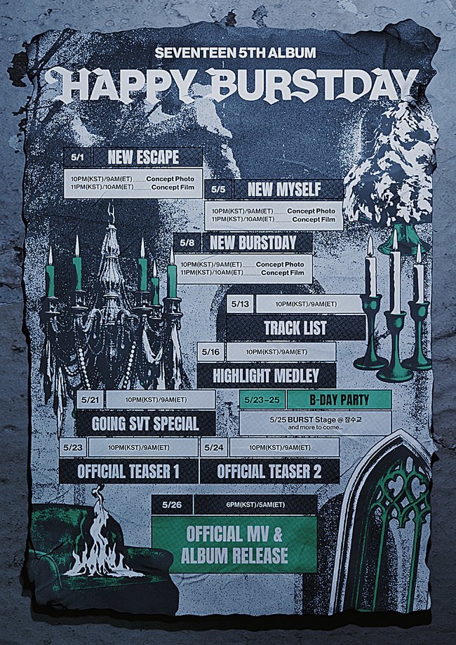 플레디스엔터테인먼트제공[뉴스엔이민지기자]그룹세븐틴이컴백을앞두고다채로운콘텐츠를예고했다.세븐틴은4월29일정규5집‘HAPPYBURSTDAY’프로모션스케줄러를공개,컴백카운트다운을알렸다.이에따르면세븐틴은5월1일과5일,8일각각‘NEWESCAPE’,‘NEWMYSELF’,‘NEWBURSTDAY’버전의콘셉트포토와필름을선보인다.이어13일트랙리스트,16일하이라이트메들리,23일~24일오피셜티저2편이순차적으로공개된다.신보와타이틀곡뮤직비디오는데뷔10주년기념일인26일오후6시베일을벗는다.가장눈길을끄는대목은23일~25일3일간진행되는‘B-DAYPARTY’다.25일서울잠수교에서펼쳐지는‘BURSTStage’를비롯해세븐틴10주년을성대하게기념할생일파티가열린다.스케줄러에는‘andmoretocome’이라고적혀있어앞으로추가공개될소식에전세계팬들의기대감이높아지고있다.이외에도세븐틴의컴백때마다뜨거운호응을얻어온자체콘텐츠‘고잉세븐틴’스페셜편이21일에돌아온다.신선한프로모션도이목을집중시킨다.세븐틴이보낸파티초대장을받고약속장소로향하는과정이캐럿(CARAT.팬덤명)시점의영상세편으로공개돼몰입감을높였다.파티장소에도착한이들앞에앞으로어떤광경이펼쳐질지궁금증이커지고있다.정규5집‘HAPPYBURSTDAY’는생일을의미하는‘Birthday’와폭발,분출,시작을뜻하는영어단어‘Burst’을결합한앨범명으로,새로운세븐틴으로재탄생하겠다는멤버들의각오가담겼다.지난28일공개된트레일러‘DAREORDEATH’는대담한도전을통해격정적으로다시태어난이들의모습을강렬하게담아내호평을받았다.뉴스엔이민지oing@기사제보및보도자료[email protected]ⓒ뉴스엔.무단전재&재배포금지Copyright©뉴스엔.무단전재및재배포금지.