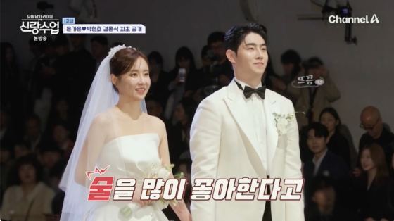 [스타뉴스|김노을기자]/사진=채널A방송화면트로트가수은가은,박현호부부의결혼식에동료들의축하가쏟아졌다.30일방송된채널A예능프로그램'요즘남자라이프-신랑수업'에서는은가은,박현호의결혼식현장이공개됐다.이날은가은,박현호결혼식에는절친이찬원을비롯해손태진,주현미,코요태신지와김종민,심진화,박주희,김의영,신소율,최희등이하객으로참석해축하를전했다./사진=채널A방송화면사회를맡은이찬원은"신랑신부와친해서이자리에있다.신랑신부를처음만나게한사람이바로저"라며"두사람의교제소식을듣고만약결혼한다면사회,주례,축가,혼수를하겠다고약속했다.그런데둘이정말로결혼할줄몰랐다.깜짝놀랐다"고밝혔다.축사는가수설운도가맡았다.그는"트로트가수1호부부의탄생"이라며"박현호친구가제아들이라축사에많은도움을받았다.술을많이좋아한다고들었다.우리아들도좀걱정이된다.어쨌든2세,가정의행복을위해술은자제해달라"고말했다.그러면서하객들을향해"두사람앞날을위해많은축복을보내달라"고덧붙였다./사진=채널A방송화면이찬원은촬영일기준결혼식을한주앞둔김종민에게축하의말을청했다.김종민은"다음주제결혼이라어떻게하나보러왔다.너무멋있다.둘이꼭행복했으면한다.아이도많이낳아라"고덕담을건넸다.홍석천은"은가은한테관심이전혀없다.우리박현호를잘키워놨는데이런식으로뺏기는거옳지않다고생각한다.잘살아라"고너스레를떨어식장을웃음바다로만들었다.한편은가은과박현호는지난12일결혼식을올리고부부의연을맺었다.김노을기자[email protected]©스타뉴스&starnewskorea.com,무단전재및재배포금지