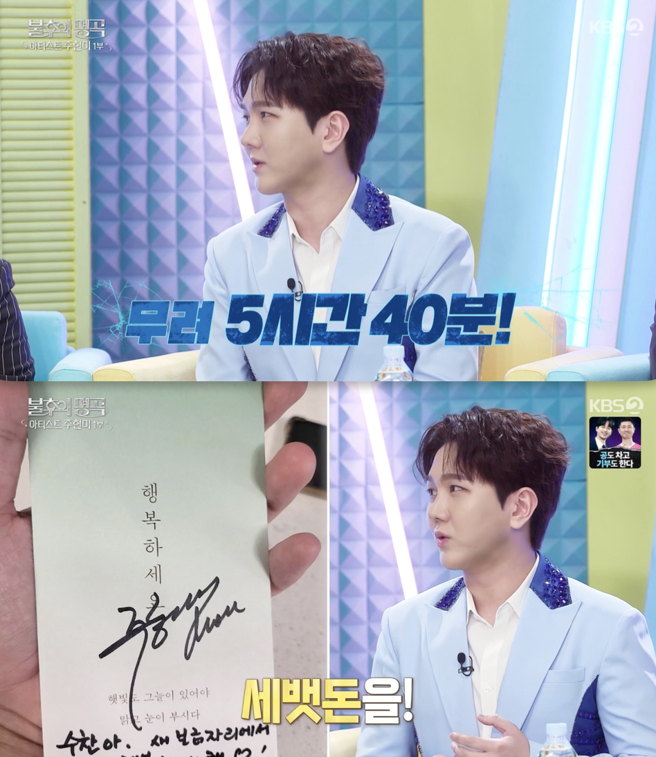 [스타뉴스|정은채기자]/사진='불후의명곡'방송화면캡쳐트로트가수김수찬이주현미와의각별한인연을공개했다.3일방송된KBS2TV'불후의명곡'은데뷔40주년을맞은트로트여제주현미특집1부로꾸며졌다.이날방송에는김수찬,에녹,홍경민X은수형,손태진,홍지민,김준수,조째즈,천록담,곽영광,오아베등실력파후배가수들이총출동해주현미를향한헌정무대를펼쳤다.이날김수찬은과거주현미와듀엣곡을발매하며음악방송에함께출연한인연을소개했다.이어"연초에는세뱃돈도받았다"며"통화도자주하는사이"라고남다른친분을자랑했다.이를듣고주현미의둘째딸이자밴드'오아베'의보컬수연은"너무통화를자주하시니까(두사람이친한걸알고있다)"고증언했다.그러자김수찬은"최장통화시간은5시간40분이다.이것저것방송되는얘기와안되는얘기를섞어서한다"고밝혀모두를놀라게했다./사진='불후의명곡'방송화면캡쳐하지만수연은이어진멘트로웃음을유발했다.그는"스피커폰으로통화를하시는데통화자체가굉장히일방적이다"며"엄마가한번'내가잠깐10분졸다가깼는데수찬이가얘기중이었다'고하더라"고폭로해현장을웃음바다로만들었다.MC신동엽도김수찬의애정을인정하며"주현미와30년차를뛰어넘은소울메이트"라고표현했다.이어"3~4시간을기본으로통화할정도고,친아들보다더자주연락한다고하더라"며김수찬을무대순서1번으로소개해눈길을끌었다.정은채기자[email protected]©스타뉴스&starnewskorea.com,무단전재및재배포금지