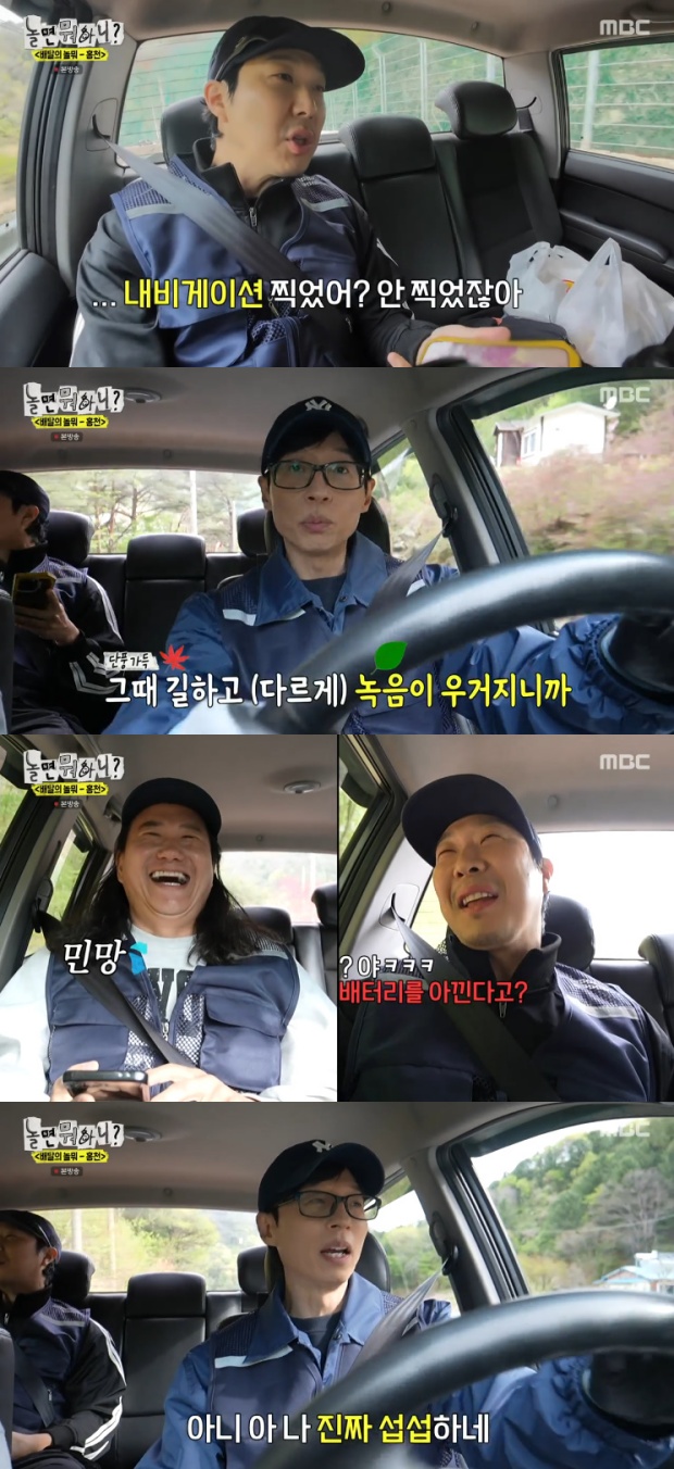 [스타뉴스|김정주기자]/사진=MBC'놀면뭐하니?'방송화면개그맨임우일이때와장소를가리지않는절약정신을선보였다.3일방송된MBC'놀면뭐하니?'에서는장뇌삼을먹으러오겠다는약속을지키러홍천산골마을을찾은유재석과하하의모습이그려졌다.지난해유재석과하하는일일택배기사로변신해택배서비스가되지않는홍천산골마을에찾아가마을사람들과다양한인연을맺은바있다.당시유재석은홍천의'웃음전도사'염희한여사와환상의호흡을자랑하며이듬해삼을먹으러오겠다고약속했다.이날유재석,하하와더불어택배회사일일인턴으로임우일이홍천을찾았다.유재석과하하는임우일의깜짝등장에"너언제왔느냐"며당황한모습을보였다.임우일은택배물품인소파테이블과어린이장난감을끌며나타나시선을모았다./사진=MBC'놀면뭐하니?'방송화면유재석은"너뭐하는지는알고온거냐"라고물었고,임우일은"저한테는뭘안알려주신다.뭘하는지는모른다.그래도감사하다"라고답해웃음을자아냈다.한편운전대를잡은유재석은내비게이션을켜지않고능숙하게목적지를향해달리다가길이헷갈린다며당황했다.임우일은곧바로내비게이션을켜목적지를확인한뒤"끌까요?"라고말했다.이에유재석은"지금데이터가아까워서그러는거냐"고핀잔을줬고,임우일은"배터리가별로없으니까아껴야한다"고답해명실상부한'알뜰남'임을증명했다.유재석은"진짜섭섭하다"고쓴소리를던져웃음을자아냈다.김정주기자[email protected]©스타뉴스&starnewskorea.com,무단전재및재배포금지
