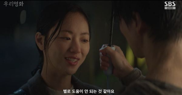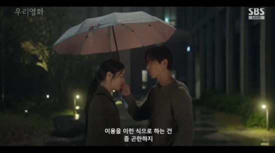 ⓒSBS'우리영화'[스포츠한국김현희기자]전여빈과남궁민이입맞춤후어색한분위기를보였다.27일방송된SBS금토드라마'우리영화'에서이제하(남궁민)는입맞춤을한이다음(전여빈)에게"연습치곤나쁘진않았는데왼쪽어깨가올라갔다.막상촬영들어가면더떨릴것이다.앵글에서는다티가난다"라고촬영의연습처럼얘기했다.ⓒSBS'우리영화'이에이다음은"별로도움이되지않은것같다"며"그래도나쁘지않았다"고쿨하게말한뒤자리를떠났다.집으로돌아온이다음은나쁜컨디션을보였고,결국병원에실려갔다.이를안이정효(권해효)는입원시키자며이다음을밖으로내보지않고자했다.스포츠한국김현희기자[email protected]©스포츠한국.무단전재및재배포금지.