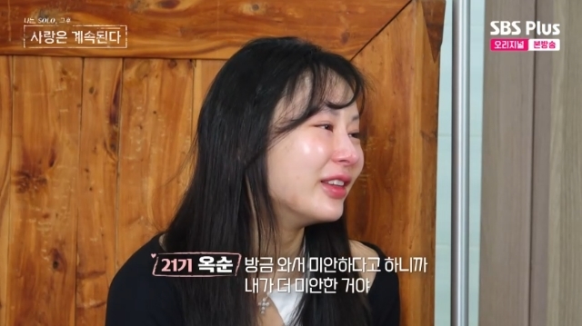 ENA,SBSPlus‘나는SOLO,그후사랑은계속된다(나솔사계)’캡처ENA,SBSPlus‘나는SOLO,그후사랑은계속된다(나솔사계)’캡처[뉴스엔서유나기자]21기옥순이미안해서눈물을펑펑흘렸다.6월26일방송된ENA,SBSPlus예능'나는SOLO,그후사랑은계속된다(나솔사계)'119회에서는네번째'한번더특집'이이어졌다.이날21기옥순은사계데이트권을24기정숙에게쓴24기영수가"24기졍숙님하고첫날데이트를할때4대1이라따로얘기할시간이없어서데이트권을쓴것"이라고따로찾아와사과하고양해를구하자,24기영수가떠난뒤눈물을보였다.2대1데이트를하고온전날에도한명에게상처줄까봐미안하다며울었던21기옥순은이번에도"어제그다대일상황을내가만든것같아서(눈물이난다).너무행복한데내가이상황을책임져야하지않냐"고토로했다.21기옥순이우는이유는특히24기영수에대한미안함이었다.21기옥순은"24기영수님한테내가상처주는것같아서미안하다.그사람이(상처)안받았을수도있지만너무좋은사람인데솔직히이성적호감이100%는아니다.70%도아니다.한40%다"라며24기영수에대한호감이절반도못넘는수치임을드러냈다.그럼에도불구하고24기영수에게먼저호감을보인것이신경쓰였던것.21기옥순은"이기적으로생각하려고24기정숙님과(데이트)가니까합리화했다.직진하는성향이라고했으니까그러면나한테잠깐왔다가간거라고합리화하려고했는데또(와서)미안하다고하니까내가더미안한거다"라고마음을설명했다.21기옥순은제작진과의인터뷰에서도"저도호감은있어서커질줄알았는데아니었다.그런행동을하는제가싫은거다.내마음이아예23기영호님이었으면23기영호님과확정을짓고스텝바이스텝했어야했는데꼬였다.그냥24기영수님이너무선하게생겨서그런마음이드나보다"라며죄책감을내비쳤다.뉴스엔서유나stranger77@기사제보및보도자료[email protected]ⓒ뉴스엔.무단전재&재배포금지Copyright©뉴스엔.무단전재및재배포금지.
