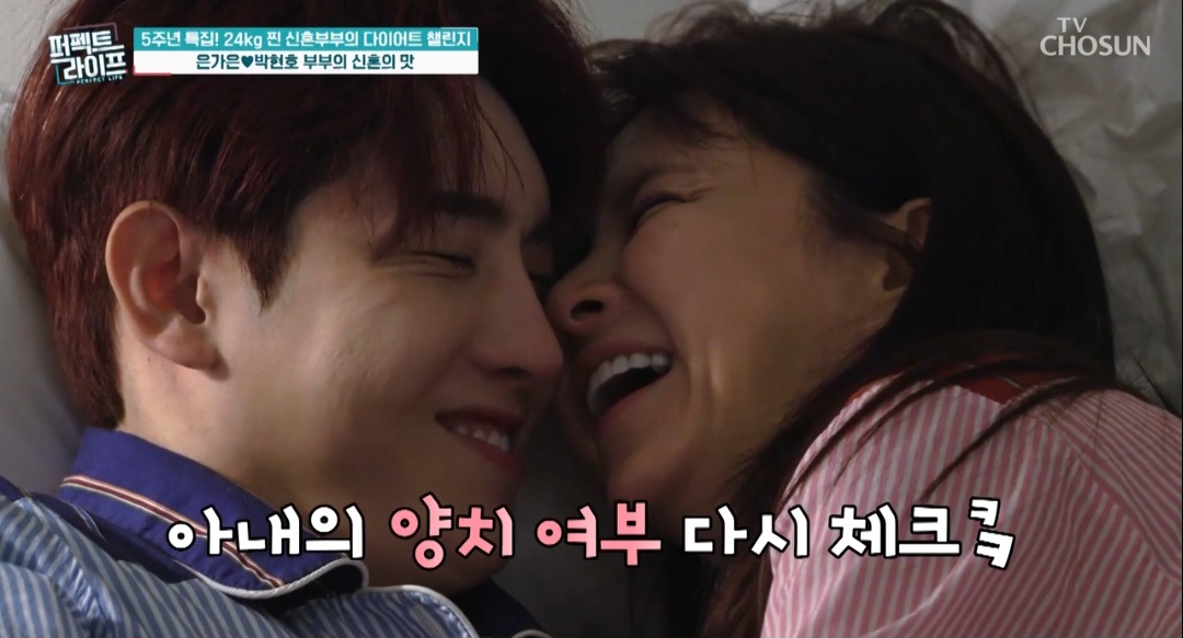 TV조선‘퍼펙트라이프’캡처TV조선‘퍼펙트라이프’캡처[뉴스엔유경상기자]은가은박현호부부가달달한신혼생활을공개했다.6월25일방송된TV조선‘퍼펙트라이프’에서는트롯계1호부부은가은(39세)박현호(34세)가출연했다.박현호가먼저잠에서깨어나자입을가리고은가은을깨웠다.박현호는“아침에입냄새날까봐”입을가린거라고말했다.은가은도바로입을가리고박현호와대화하는모습이현영이“서로입가리고이야기하는거냐”며귀여워했다.은가은이“양치하고올게”라며일어나려하자박현호는안으며붙잡았고,이에은가은이입을가린손을떼자입냄새에기절하는연기를펼쳤다.이어부부는슬리퍼하나를나눠신고양치를했고,은가은은박현호를보고“잘생겼다”고감탄했다.반면박현호는은가은이양치하며피를보이자“양치좀하고살아라”고잔소리해웃음을자아냈다.오지호는“로맨스와코미디를동시에봤다”며웃었다.그렇게양치를마친신혼부부는“우리가해야할게있다”며모닝키스를하며애정행각을벌였다.(사진=TV조선‘퍼펙트라이프’캡처)뉴스엔유경상yooks@기사제보및보도자료[email protected]ⓒ뉴스엔.무단전재&재배포금지Copyright©뉴스엔.무단전재및재배포금지.