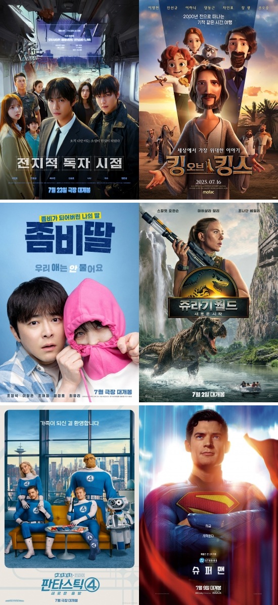 K-애니부터DC신작까지,국내외화제작들이여름시장정조준(MHN김세연인턴기자)7월극장가는국내외기대작들이총출동한다.먼저글로벌누적조회수3억뷰를기록한웹소설을원작으로한'전지적독자시점'이다.다양한크리처와상상의공간이CG로구현되었다.오는7월23일개봉예정이다.웹툰을원작으로한코믹드라마'좀비딸'도기대작중하나이다.이세상마지막좀비가된딸을지키기위해훈련에돌입하는아빠의이야기를담은영화는배우조정석이아버지역을맡았다.오는7월개봉예정이다.할리우드블록버스터들도개봉을앞두고있다.'쥬라기월드:새로운시작'은지구상가장위험한섬에들어간과학자들이감춰져있던진실을마주하며벌어지는생존기를그린다.오는7월2일개봉예정이다.'슈퍼맨'은DC유니버스를재정비하는작품으로,제임스건감독이연출을맡아새롭게재해석된히어로의귀환을그린다.오는7월9일개봉예정이다.'판타스틱4:새로운출발'은우주비행자4인이얻게된능력과그들이맞서는초월적존재'갤럭투스'와의전투를다룬다.이가운데북미에서먼저개봉한'킹오브킹스'도주목받고있다.북미에서먼저개봉해북미박스오피스6천3백만달러를돌파하며북미박스오피스역대한국영화1위,역대아시아애니메이션2위를기록했다.이병헌,진선규,이하늬등국내배우와함께할리우드스타들이목소리출연에참여했다.오는7월16일개봉예정이다.슈퍼히어로,웹소설,웹툰,가족단위관객과애니메이션팬까지아우르는다양한작품들이오는7월관객과의만남을기다린다.사진=시테스,롯데엔터테인먼트,NEW,유니버셜픽쳐스,워너브라더스코리아,월트디즈니Copyright©MHN.무단전재및재배포금지.