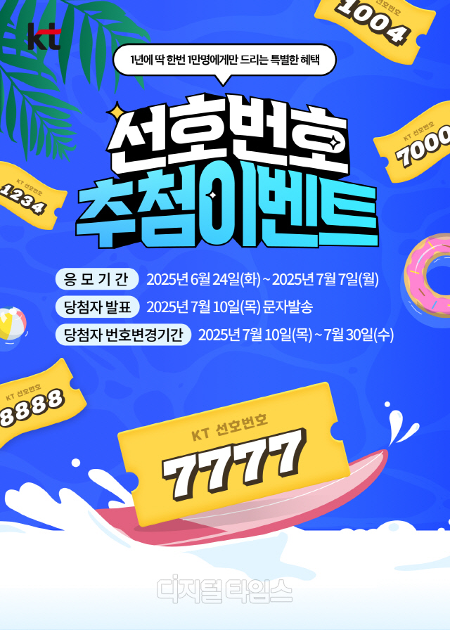 7월7일까지1인당최대3개응모가능KT가올해통신3사중처음으로선호번호추첨입네트를진행한다.KT제공KT가'선호번호추첨이벤트'를내달7일까지전개한다.KT는통신3사중올해처음으로해당이벤트를진행하며선호번호는식별이용이한휴대전화번호뒤4자리로고객들의선호도가높은번호다.이번에KT에서응모할수있는선호번호는AAAA,0000,000A,A000,AA00,00AA,ABAB,ABCD,ABCD-ABCD형식의번호와특정의미를갖고있는번호(1004,2580등)등총9가지유형이다.1인당최대3개까지응모할수있다.지난해인기를끈선호번호는국번과뒷자리번호가똑같은'ABCD-ABCD'형이었으며경쟁률은284대1에달했다.선호번호를원하는고객은KT매장·KT닷컴,모바일고객센터마이케이티앱을통해응모할수있다.KT고객뿐아니라타통신사및알뜰폰(MVNO)이용고객도참여할수있다.당첨결과는7월10일에발표된다.당첨자는개별안내사항을담은문자메시지를받게된다.고객은당첨된번호사용을위해7월30일까지당첨된번호를KT매장과KT닷컴에등록해야한다.추첨행사는과학기술정보통신부,한국통신사업자연합회(KTOA)등관계자들이참관해무작위추첨으로투명하게진행된다.선호번호는타인에게양도할수없으며선호번호를사용중이거나1년이내선호번호당첨이력이있는고객은응모할수없다.김영욱기자[email protected]©디지털타임스.무단전재및재배포금지.