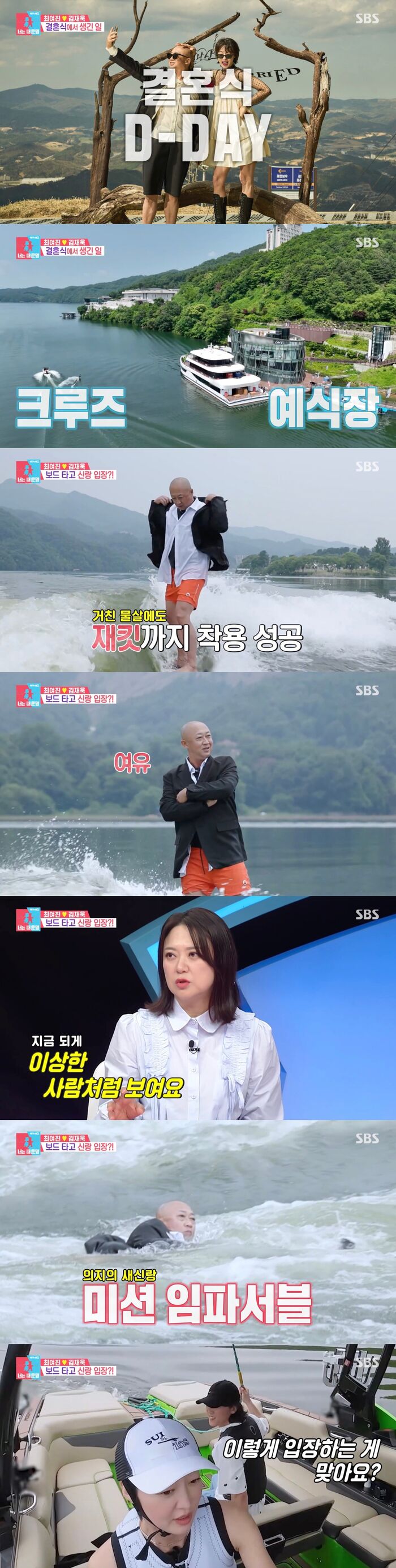 “누가좀말려줘요”…말은그렇게했지만,표정은웃고있었다.결혼식에웃음,물,눈물까지다담긴날이었다.16일방송된SBS예능‘동상이몽2-너는내운명’에서는배우최여진과김재욱부부의이색크루즈결혼식준비과정이전파를탔다.단순한결혼식이아닌,두사람의케미와현실웃음,감동까지오롯이담긴하루였다.이날김재욱은“특별한결혼식인만큼,입장도남다르게하고싶다”며보트위웨이크보드입장을제안했다.이를들은최여진은“저아저씨를누가말려”라며고개를저었고,남편김재욱은블랙슈트를입은채물살을가르다결국물에풍덩빠졌다.“슈트다젖게뭐야”라는최여진의푸념속에서도결혼식은강행됐다.예물시계는골프공에담아전달하기로했고,김재욱은이를직접준비했지만공은물에빠지고,반려견이입수하는소동까지이어졌다.현실부부라가능한순간이었다.결혼식당일,최여진은“드레스입고세걸음이면버진로드끝나겠다”고웃으며탑승했고,선상결혼식장은부부의바람을최대한반영한구조로완성됐다.친구이현이와김원효가사회를맡고,축가는절친아이비가맡아분위기를감성적으로채웠다.예물교환은프로골퍼이상훈이성공시켰고,감동의클라이맥스는최여진의새아버지에게서나왔다.“초심잃지말고,서로의슬픔과기쁨에함께할수있는부부가되길바란다”는축사에,최여진은조용히눈시울을붉혔다.“결혼식안하고혼인신고만하자던나였는데…막상하니까다르다”그날최여진의말처럼,이결혼식은어설펐지만완벽한하루였다.[김승혜MK스포츠기자][ⓒMK스포츠,무단전재및재배포금지]Copyright©MK스포츠.무단전재및재배포금지.