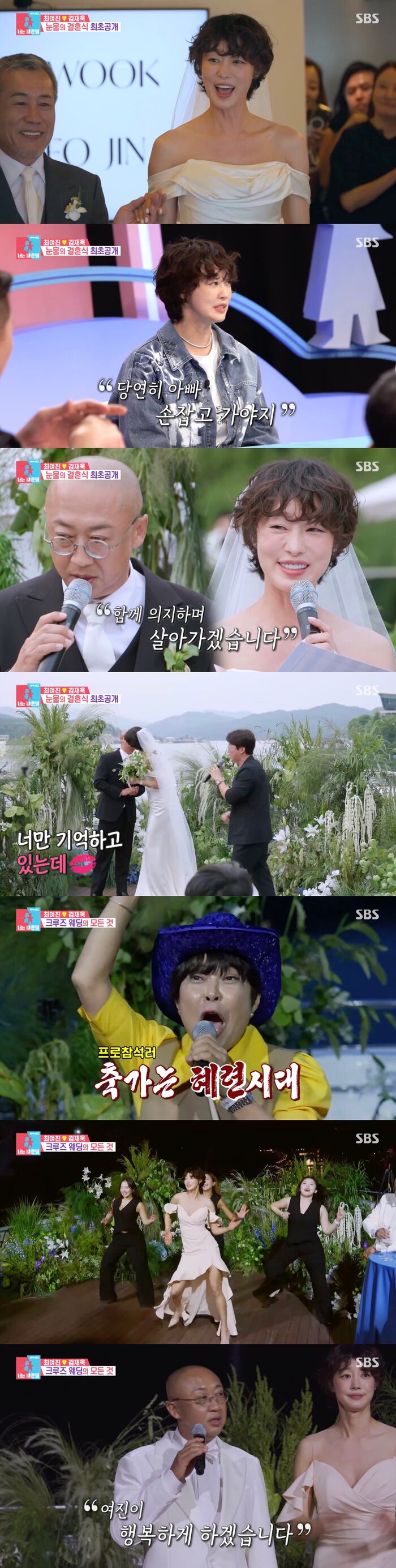 [SBS연예뉴스|김효정에디터]최여진과김재욱이결혼식을올렸다.16일방송된SBS'동상이몽시즌2-너는내운명'(이하'동상이몽2')에서는최여진과김재욱의결혼식이공개됐다.이날방송에서는두사람의특별한결혼식이열렸다.선상에서진행된크루즈웨딩에이현이와김원효가MC로나섰다.앞서특별한결혼식을위해웨이크보드입장을연습했던김재욱.하지만우려속에특별함을포기하고평범한입장을선택해눈길을끌었다.이어최여진은아버지의손을잡고입장했다.이에최여진은"아빠가새아버진데괜찮겠냐고묻더라.그래서아빠가키워줬는데당연히아빠손잡고가야지했다.정말울컥하더라"라며당시느낌을밝혔다.드디어나란히선두사람.두사람은"평생서로를존중하며함께의지하며살아가겠다"라며결혼서약을했다.그리고프로골퍼지인의어프로치로전달받아서로에게예물을전했다.이어아이비와허경환의축가가이어졌다.특히허경환은"키작은남자도키큰신부를맞이할수있다는용기를주셔서고맙다"라며재치있는소감을전했다.그리고두사람은허경환의노래에맞춰뽀뽀타임을공개해보는이들까지흐뭇하게했다.2부피로연은배가출항을하며이어졌다.두사람과하객들은"두사람행복안하면안돼"라고행복을빌며축배를나눴다.그리고1부에서보지못해아쉬움을자아냈던조혜련이축가를선보여결혼식장을콘서트장으로만들었다.화려한축가를선보인조혜련은"여진이를여걸식스때부터봐왔는데,정말로멋진사람을만난거같다"라며최여진의결혼을축하했다.이어그는"남편분이랑제가같은입장인데진짜잘할거다.산전수전공중전겪었기때문에잘할거다.제가경험자인데잘살거다.행복하세요"라고두사람의행복을빌었다.마지막으로신부최여진이줌바댄스까지선보여분위기를띄웠다.이에김재욱은"행복하게사는게보답이라생각한다.열심히잘살겠다.여진이행복하게해주겠다"라며하객들에게감사인사를전했다.한편방송말미에는정석용이이제는아내가된여자친구에게"사랑해"라며달콤한영상편지를띄워보는이들의환호를자아냈다.Copyright©CopyrightⓒSBS.Allrightsreserved.무단전재,재배포및AI학습이용금지