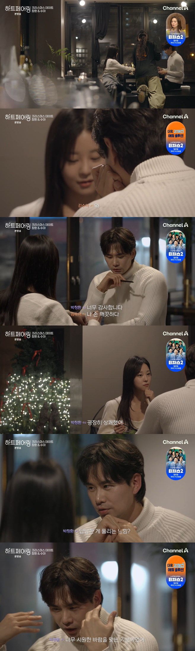 티브이데일리포토[티브이데일리이기은기자]‘하트페어링’기장박창환,매기녀김수아와커플가능성이높아졌다.13일밤방송된채널A예능프로그램‘하트페어링’14회에서는여자출연자제연,지원,하늘,남자출연자찬형,우재,지민,매기남창환,메기녀채은,새로운매기녀김수아등이최종선택을앞둔현장이공개됐다.개중유일한40대인창환은새로들어온매기녀수아에게매력을느꼈고,크리스마스데이트를하면서수아에게노련하게자기마음을표현하며직진했다.수아역시만만치않았다.그는편안하게창환의말에반응하고리액션을해주며연인같은기류를조성했다.김수아역시30대이며나이와무관하게두사람은말이잘통하는사이였다.최종커플가능성을배제할수없는이유다.창환은이곳에서아예수아에게“외모도내스타일.성격도쿨하고좋다.좋아하지않을이유가없다”고간접고백했다.[티브이데일리이기은기자[email protected]][Copyrightⓒ*세계속에新한류를*연예전문온라인미디어티브이데일리(www.tvdaily.co.kr)/무단전재및재배포금지]Copyright©티브이데일리.무단전재및재배포금지.