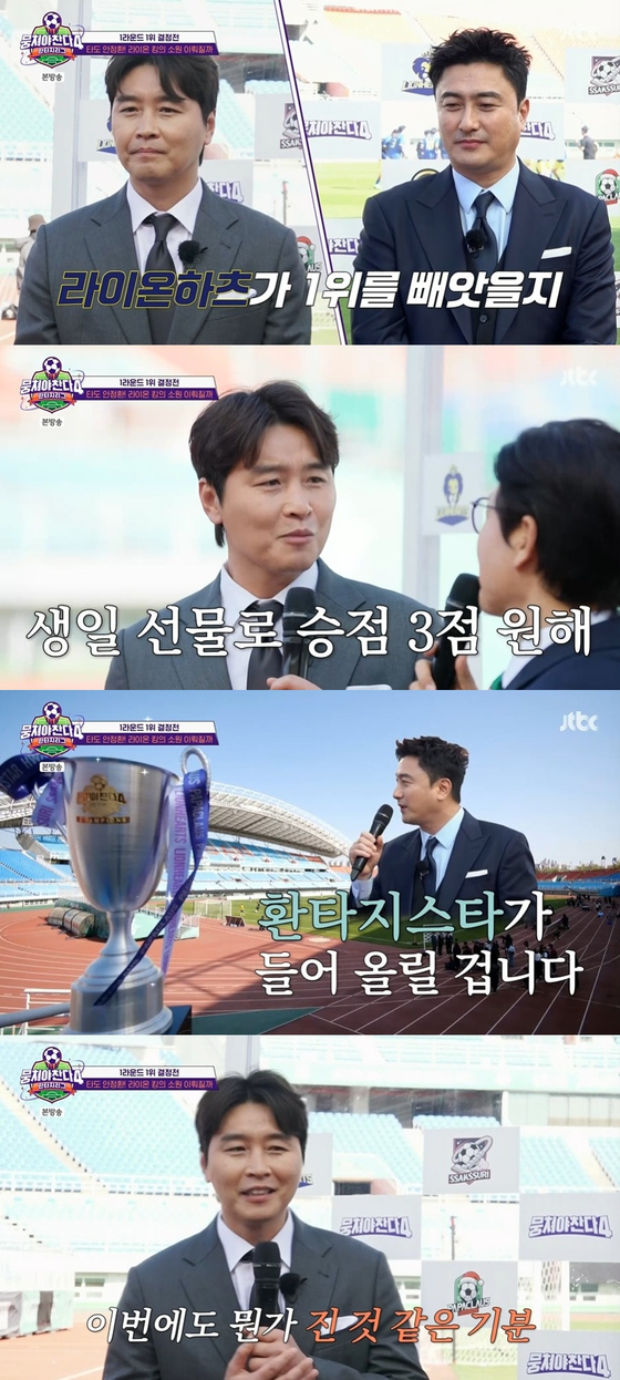 JTBC'뭉쳐야찬다4'방송캡처.JTBC'뭉쳐야찬다4'판타지리그의첫1위팀이탄생했다.8일'뭉쳐야찬다4'에서는판타지리그1라운드1위자리를두고이동국감독의'라이온하츠FC'와안정환팀의'FC환타지스타'가격돌하는모습이그려졌다.앞서박항서감독의'파파클로스FC'와김남일감독의'싹쓰리유나이티드'는각각4위와3위를확정했다.이날1위결정전을앞두고이동국과안정환은신경전을벌였다.그동안안정환에게이긴적이없다는이동국은“징크스는깨라고있는것이다.마침어제내가생일이었다.그래서선수들이승점3점을생일선물로챙겨준다면행복할것같다”고각오를밝혔다.그러자안정환은“우린길게본다.생일상을엎을수는없고,승점챙겨는주겠다.그러나우리는언젠가저트로피를들어올릴것이다”고여유를보였다.JTBC'뭉쳐야찬다4'방송캡처.연일승리를거둔FC환타지스타는열의가가득했다.가수정승환,CIX승훈등은뮤직비디오촬영,해외공연등에도틈틈이축구공으로연습에매진하며승리에대한집념을드러냈다.라이온하츠FC는이동국을위한깜짝생일파티를준비했다.축구화를놓고왔다는최종우에'군기반장'이신기가“정신나갔냐”며험악한분위기를만들었다.그러나곧선수들이직접만든케이크와단체사진액자를들고생일축하노래를불러이동국의웃음을자아냈다.마침내시작한1위결정전은초반부터치열했다.FC환타지스타는알베르토,게바라의부상으로인해모델이호연,더킹덤루이가대체선수로선발됐다.이에안정환감독은'승훈-류은규-칸'3인과'원톱'차서원체제로진영을재정비했다.'날썐돌이'승훈은상대편의공격을계속끊어내며활약했지만,차서원은자신의포지션에좀처럼적응하지못하며기회를번번이놓쳤다.라이온하츠FC에서는백성현이눈길을모았다.그는FC환타지스타의에이스류은규를맨투맨으로마크했다.중원을누비면서결정적인찬스를계속만들어내기도했다.그의활약에기대천주안등이날카로운슈팅을날리면서분위기를몰아갔다.안정환감독체제에서제대로활약하지못했던최종우,남우현도안감독앞에서보란듯이개인기를펼쳐김남일,박항서감독의극찬을이끌었다.JTBC'뭉쳐야찬다4'방송캡처.FC환타지스타에서는오재현이강력한슈팅으로분위기를끌어올렸다.전반전종료직전에는라이온하츠FC이용우가헤딩도중방태훈골키퍼와충돌하면서페널티킥기회를얻었다.강력한슈팅을자랑하는천주안이페널티킥을찼으나,방태훈이이를막아내며FC환타지스타는실점위기를모면했다.후반전은라이온하츠FC의맹공격이펼쳐졌다.전반전에서페널티킥에실패했던천주안은“후반전에더열심히뛰겠다”는각오와함께폭발적인드리블돌파로이신기의빈자리를제대로채웠다.골키퍼송하빈은날카로운류은규의슛을번번이막아내며여러번'슈퍼세이브'에성공했다.JTBC'뭉쳐야찬다4'방송캡처.분위기가과열될수록중원싸움은한층더치열해졌다.최종우의푸싱파울등이발생했고,FC환타지스타의맹공격에김진짜는육탄방어까지나섰다.경기가답보상태에빠지자,이동국감독은남우현과최종우의포지션을서로바꿨다.그러자마자남우현과최종우가완벽한호흡으로찬스를계속만들었다.이동국감독의포지션변경은결국선취골로이어졌다.후반24분이용우의패스,남우현의크로스가최종우에게연결됐고,그가과감하게헤딩슛을날리면서1점을획득했다.최종우는안정환감독의트레이드마크인'반지키스'세레모니를하며설움을씻어냈다.라이온하츠FC는마치우승한듯기뻐하며방방뛰었다.열심히한만큼크게실망한FC환타지스타는안정환감독의위로를받으며전의를다잡았다.유지혜엔터뉴스팀기자[email protected]사진=JTBC'뭉쳐아찬다4'방송캡처Copyright©JTBC.무단전재및재배포금지.