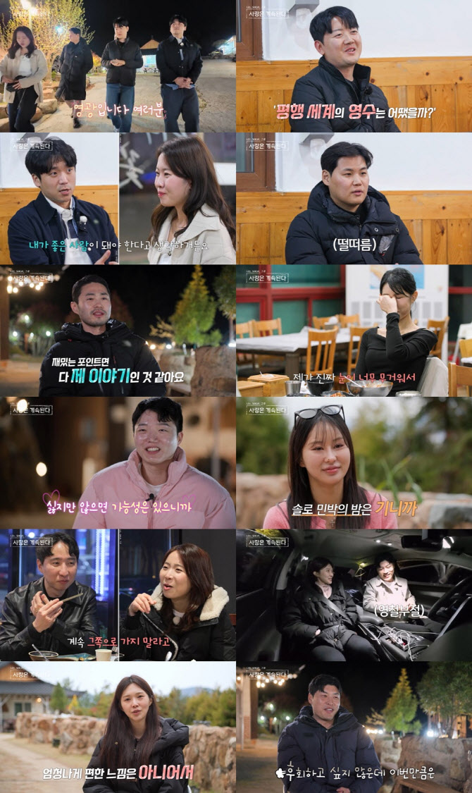 17기옥순,25기영철과'묵언수행'데이트19기정숙,25기광수와데이트에"피곤해"[이데일리스타in윤기백기자]‘나는SOLO’(나는솔로)출신화제의출연자들이‘나솔사계’에서첫탐색전을펼쳤다.(사진=‘나솔사계’방송화면)5일방송한SBSPlus와ENA의‘나는SOLO,그후사랑은계속된다’(나솔사계)에서는‘밤마실데이트’후달라진‘솔로민박’의로맨스가그려졌다.이날방송은닐슨코리아집계결과,평균2.3%(전국유료방송가구기준SBSPlus·ENA합산수치)의시청률을기록했으며,분당최고시청률은2.8%까지치솟았다.또한굿데이터코퍼레이션이집계하는6월1주차‘펀덱스차트’내‘TV비드라마화제성’부문에서2위에오른‘나는SOLO’에이어7위를차지해뜨거운인기를증명했다.앞서24기정숙은‘밤마실데이트’선택에서23기영호-24기영수-25기영수-25기영호의선택을받아‘4:1데이트’의주인공이됐다.이날24기정숙은식당에서네남자들에게둘러싸여행복해했으며,“이중에‘첫인상선택’때픽한사람있다,없다?”라는남자들의질문에“예스!”라고시원하게답했다.25기영호는24기정숙바로옆에앉아“이번식사는제가사도되냐?내마음껏먹고싶어서그렇다”라고‘결제플렉스’를선언했다.24기정숙은25기영호의멘트에고마워했고,이상형을묻는질문에는“재밌고티키타카가잘되는남자”라고답했다.그러던중,24기정숙은계속‘어미새’처럼구운고기를23기영호에가가져다줬는데,이에대해23기영호는제작진과의인터뷰에서“계속고기를챙겨주시고,자리도일부러(제옆인)중간에앉으려고하는느낌”이라며정숙에게더욱커진마음을내비쳤다.‘4:1데이트’를마무리한뒤,24기정숙은5분씩네남자와1:1대화를했다.가장먼저24기영수는“평행세계의영수는어땠을까하는아쉬움이진하게남았다.그래서‘서울에서다음에보자’고했을때도내가계속가려고하지않았냐?”라고‘나는SOLO’출연후에도계속관심을보였던자신의마음을어필했다.대화후24기영수는제작진앞에서“제가생각할땐여지가느껴졌다.한번해보자”며각오를다졌다.뒤이어25기영호는24기정숙에게“(‘나는SOLO’24기때)생각보다선택을못받았다고느꼈다.오늘보니까제생각이맞았던거같다”고‘플러팅’했다.그러면서그는24기정숙을‘첫인상선택’때뽑았다고밝혔으며,두사람은연애관과삶의가치관이정확히일치한다는공통점을확인했다.내친김에25기영호는“제가앞으로도알아보는게괜찮으시냐?”고물었는데,24기정숙은“영광이다.제가누구뽑았는지티났냐?”라고자신역시25기영호를첫인상때선택했음을귀띔해분위기를후끈달궜다.반면,23기영호는‘결혼’과‘가족’에대한심도깊은얘기를나누다24기정숙과가치관차이를느꼈다.대화종료후23기영호는제작진과의인터뷰에서“모범적인답변을해주긴했는데,말대로세상이흘러가는건아니니까,그때부터(24기정숙이)멀게느껴졌다”고털어놨다.마지막으로25기영수는“24기정숙님의활발한모습을좋게봤던사람으로오늘은너무차분하셔서조금어안이벙벙”이라며“오픈마인드로잘알아봤으면좋겠다”고당부(?)했다.‘1:1대화’를마친그는“24기정숙님의(호감남)후보자에제가포함돼있지않을까?재밌는사람이좋다고하셨는데,재밌는포인트는다제얘기인것같아서”라고긍정회로를돌렸다.하지만,24기정숙의‘픽’은25기영호였다.24기정숙은제작진에게“연애가치관,화해방식등이똑같았다”고25기영호에게가장마음이쏠렸음을밝혔다.24기광수-19기정숙은다소삐걱거리는분위기에서데이트를시작했다.내향적인데다24기광수의‘흑역사’까지모두확인하고온19기정숙은“방송에서노래엄청부르시는걸봤다”며광수의‘주크박스’본능을부담스러워했다.24기광수는노래없이자분한모습만보였고,이후두사람은‘헬친자’라는공통점으로가까워졌다.그러나피로가몰려든19기정숙은“잠이온다”,“피곤해”라고토로했고,순식간에웃음기가사라진24기광수는“나에대한마음이있는지,없는지모르겠다”며고민에빠졌다.다행히19기정숙은“진짜로피곤했는데절기다려주고이해해줘서고마웠다”며24기광수에게호감이올라갔음을내비쳤다.비슷한시각,21기옥순은숙소에서홀로‘고독정식’을먹었다.그는친구와전화통화를하면서“상여자는이런거에흔들리지않는다”는친구의조언을새긴뒤,“23기영호-24기영수에게관심이있다”면서전투력을끌어올렸다.6기현숙과4기정수은‘밤마실데이트’에서‘찐친모드’를켰다.품절남녀친구들에게“너무좋은와이프감이자신랑감”이라는극찬을받아왔다는두사람은“기혼자가이런말하는게무슨의미가있어!”라며폭풍공감대를형성했다.그럼에도데이트후6기현숙은제작진앞에서“정말고마운데이성적으로는잘모르겠다”고4기정수에게알쏭달쏭한태도를보였다.25기영철은꿈에그리던17기옥순과‘1:1데이트’를했지만‘뚝딱봇’처럼행동했다.25기영철은17기옥순의눈도제대로마주치지도못했으며,“방송을보는거같다”며팬심(?)을보였다.자신의이상형에대해서는“오늘제앞에있다”고수줍게어필했지만,거의‘묵언수행’에가깝게입을닫았다.결국17기옥순은제작진과의인터뷰에서“대화할때편한느낌은아니었다”며아쉬워했고,25기영철은“좋