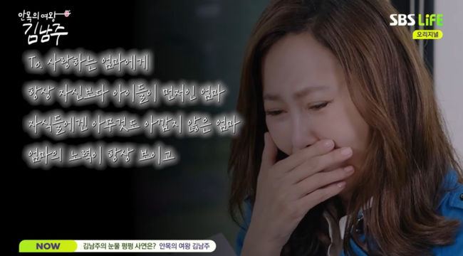 방송화면캡쳐[OSEN=김예솔기자]배우김남주가눈물을보였다.5일에방송된SBSLife예능프로그램'안목의여왕김남주'에서는김남주가아들찬희군의편지를받고눈물을보였다.랄랄은"딸이너무귀엽다.충격적이다.인간이이렇게귀엽나싶다"라며"인간이지구를통틀어서제일사랑스럽구나.그때부터인류애가생겼다.사람한명한명이소중해졌다.마음가짐이달라졌다"라고말했다.방송화면캡쳐랄랄은"아기를키우고엄마한테개기지않는다.엄마가돼보니까난정말패륜아구나싶었다.내가엄마한테무슨짓을저지른건가싶다.요즘은맨날전화한다"라며"서빈이도커서결혼해서아이를낳지않은이상내마음을모를것같다"라고말했다.랄랄은"내가서빈이를챙기고있으면엄마는나를챙긴다"라며엄마의마음을느낀다며술을마신다고말해주위를폭소케했다.김남주는"누구나시행착오를겪는다.잘한다고하는데나중에보면잘하는게하나도없다"라고말했다.방송화면캡쳐김남주는랄랄을보며"사람이너무좋은사람이다"라고칭찬하며감탄했다.김남주는평소랄랄을너무좋아해서굿즈를선물받았다고말했다.김남주는이명화의조끼를입으면서"엄마가이걸너무노린다"라고말해웃음을자아냈다.김남주는랄랄의딸을위해직접선물을준비해눈길을끌었다.김남주는"이명화씨로봤는데오늘이자리는유라를알게됐다"라고말했다.방송화면캡쳐한편,이날제작진이김남주의생일을축하하며깜짝이벤트를준비했다.제작진은아들의편지를준비했다.김남주는아들의편지를보고눈물을쏟았다.김남주는"이걸아들이썼나"라며감동했다.또,김남주는또다른편지를열어봤고김남주의어머니가쓴편지를보고또한번눈물을보였다./[email protected][사진:SBSLife예능프로그램'안목의여왕김남주']Copyright©OSEN.무단전재및재배포금지.