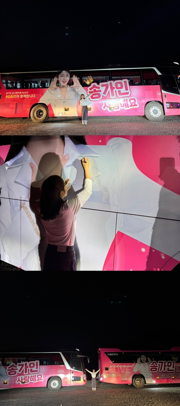 트롯여제송가인이남다른팬사랑으로또한번감동을안겼다.송가인은25일공식SNS를통해팬덤‘AGAIN(어게인)’이준비한‘어게인버스’2호차앞에서촬영한인증샷과함께진심어린감사인사를전했다.‘어게인버스’는송가인의콘서트,행사,축제현장을찾아다니며응원을이어가는팬들의차량으로,지난해1호차가만들어진데이어20일2호차가탄생하며송가인의남다른팬파워를실감케했다.트롯여제송가인이남다른팬사랑으로또한번감동을안겼다.버스에는하얀블레이저차림의송가인이두손을입옆에모아외치는듯한응원포즈로래핑되어있으며,‘송가인사랑해요’라는문구가함께담겼다.차량뒷면에는최근발매한정규4집‘가인;달’의앨범이미지와함께‘평생AGAIN’이라는문구가적혀있어눈길을끌었다.송가인은‘우리어게인버스2호차!탄생!사랑해요어게인’이라는각별한애정이담긴문구로팬들의응원에화답하며2호차버스를배경으로다양한포즈의인증샷을남겨기쁨을표현했다.또한,1호차와2호차사이에서서환한미소를지은사진도함께공개해팬들에게훈훈한감동을선사했다.특히,송가인이직접현장을찾아버스에사인을남기는모습은팬들에대한특별한애정을다시금실감하게했다.여기에3호차까지준비중이라는사실이알려진만큼,송가인의영향력을엿볼수있었다.한편,송가인은최근팬들의성원에보답하기위해개최한‘2025송가인팬미팅“평생”-The차오르다’를성황리에마무리하고,예능,라디오,유튜브콘텐츠등을통해서도꾸준히팬들과의소통을이어가고있다.[금빛나MK스포츠기자][ⓒMK스포츠,무단전재및재배포금지]Copyright©MK스포츠.무단전재및재배포금지.