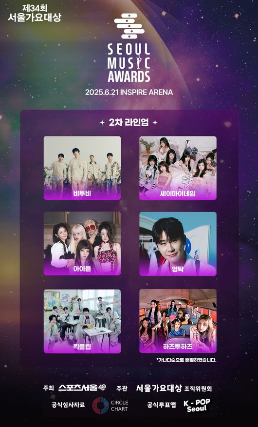 [OSEN=박소영기자]‘제34회서울가요대상'이2차라인업을공개했다.'제34회서울가요대상'(스포츠서울주최·서울가요대상조직위원회주관)은21일영탁,비투비(BTOB),아이들(i-dle),세이마이네임(SAYMYNAME),킥플립(KickFlip),하츠투하츠(Hearts2Hearts)(데뷔순)등2차라인업을발표했다.영탁은지난해에이어올해도'서울가요대상'에함께한다.'제33회서울가요대상'에서본상및트로트상을받으며2관왕을차지했던영탁.그는'슈퍼슈퍼','폼미쳤다','찐이야','니가왜거기서나와'등다양한히트곡으로팬들의열렬한지지를받고있는가수다.올해도활발히활동을이어가고있는그가'제34회서울가요대상'에참석해어떤모습을보여줄지기대를모은다.'믿고듣는그룹'비투비도'제34회서울가요대상'에출격한다.비투비는'제27회서울가요대상'본상,'제25회서울가요대상'발라드상을받으며'서울가요대상'을화려하게빛낸바있다.최근앨범'비투데이(BTODAY)'를발매하며섬세한감정선과가창력을뽐내화제를모았다.오랜만에'서울가요대상'에참석하는이들을향한궁금증도높아진다.그룹명을변경한후새로운여정에돌입한아이들이'제34회서울가요대상'에함께한다.아이들은지금까지'화(火花)','TOMBOY'(톰보이),'Nxde'(누드),'퀸카'(Queencard)등다수의히트곡을발매해사랑받은명실상부한대세그룹이다.최근새미니앨범'위아(Weare)'를발매,타이틀곡'GoodThing'은각종음원사이트톱100차트에진입하는등뜨거운인기를보여주고있다.'5세대핫루키'세이마이네임과킥플립그리고하츠투하츠도'제34회서울가요대상'라인업에이름을올렸다.세이마이네임은지난2024년10월데뷔한7인조걸그룹이며,아이즈원출신히토미가세이마이네임으로재데뷔해주목을받았다.지난3월두번째EP'마이네임이즈'(MyNameIs…)를발매하며한터차트,써클차트실시간,데일리차트상위권에올라저력을입증했다.특히최근'KCONJAPAN2025'(케이콘재팬2025)에첫출격한것은물론,일본정식데뷔전임에도공중파음악방송출연,단독팬미팅을성황리에개최하며남다른인기를보여주고있다.'JYP차세대보이그룹'킥플립이'제34회서울가요대상'에참석한다.첫미니앨범'Flipit,Kickit!'(플립잇,킥잇!)발매당시단숨에한터차트와써클차트일간앨범차트정상에등극한킥플립.오는26일미니2집'KickOut,FlipNow!'(킥아웃,플립나우!)로첫컴백을앞두고있는가운데,'제34회서울가요대상'에서의활약도호기심을높인다.하츠투하츠도'제34회서울가요대상'에서만날수있다.하츠투하츠는지난2월첫싱글'TheChase'(더체이스)를발매하고전격데뷔했다.초동(발매후1주일)판매량40만장을돌파하며놀라운화력을보여줬고,지난10일(현지시간)에는미국유명뮤직페스티벌'아이하트라디오왕고탱고2025'무대에올라글로벌인기를과시했다.'제34회서울가요대상'에는변우석,정은채,남규리,옹성우,박주현,장규리등의쟁쟁한배우시상자뿐만아니라TXT,QWER,피원하모니,피프티피프티,웨이브투어스,키키등다양한K팝아티스트들이참석해자리를빛낼예정이다.향후어떤아티스트가'제34회서울가요대상'에합류할지귀추가주목된다./[email protected][사진]제공Copyright©OSEN.무단전재및재배포금지.