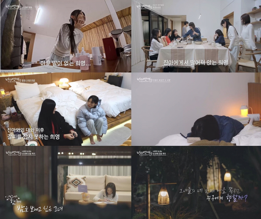 '너의연애'에서깊어지는관계속생겨나는사소한오해들로결국출연진들이눈물을쏟았다.iMBC연예뉴스사진5월23일(금)공개되는웨이브(Wavve)오리지널'너의연애'7,8화에서는점점깊어지는관계속오해와서운함,그리고새롭게생겨나는러브라인의기류들로감정의소용돌이가몰아칠예정이다.지난6화에서진아는전과는다르게싸늘해진희영에게대화를신청하며처음으로본인의속마음을털어놓으며진솔한감정을표현했다.진아는희영에게서로가표현하는언어의감도가다른것같아오해가쌓인것같다며본인은희영에대한마음이크다는것을말하던찰나,민우가등장하며둘의대화는종지부를찍지못한채흐지부지하게끝나고말았다.둘의대화는오늘공개되는7화에서이어진다.지난대화이후희영은서연에게오히려진아에대한혼란스러운마음만더욱가중되었다고고민을털어놓는다.진정성있는모습을보여주길바랐는데,진아의표현과는다르게마음쪽지등상반된모습만비쳤기때문.계속해서대화를이어가고자하는진아와혼란스러운마음에말을아끼고있는희영의오해가이번회차에서풀릴수있을지관심이쏠린다.이런가운데,마음을주고받는네번째쪽지가진행된다.이번마음쪽지는평소마음쪽지와는다르게두개의쪽지를주고받아야하는데,하나는바로'함께밤을보내고싶은1명'에게전달하는쪽지고,두번째는'나를긴장하게만드는사랑의라이벌1명'에게전달하는쪽지인것.바로적을준비가되어있다고말하며거침없이써내려가는입주자가있는한편,고심하며쉽게펜을들지못하는입주자들도생겨난다.한편,출연진들이본방송을보며못다한이야기를나누는스페셜코멘터리영상또한오늘(23일)웨이브공식유튜브채널을통해업로드된다.출연진중다교,미랑,서연,희영이출연해1화부터4화까지의영상을함께보며비하인드에피소드를풀어갈예정이다.iMBC연예유정민|사진출처웨이브Copyright©MBC연예.무단전재및재배포,AI학습금지.