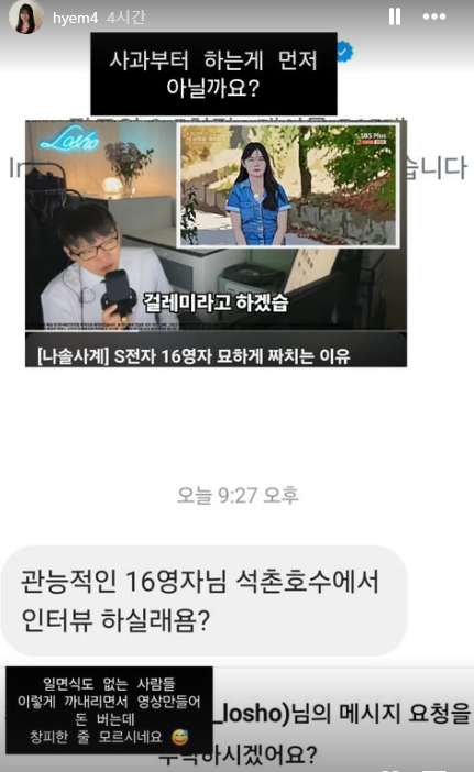 16기영자소셜미디어[마이데일리=임현주기자]'나는솔로'16기영자가불편한심기를드러냈다.16기영자는19일소셜미디어스토리에한장의사진을업로드했다.사진엔"사과부터하는게먼저아닐까요"라는글과함께어느유튜버의창작영상을캡처한모습이담겼다.그유튜버의창작영상엔"S전자16영자묘하게짜치는이유,걸레미라고하겠슴"이라는문구가보인다.그유튜버가16기영자를아무런근거없이비하하고비속어를사용해16기영자가기분이상했던것.16기영자소셜미디어16기영자가기분이상한상태에서그유튜버로부터"관능적인16영자님석촌호수에서인터뷰하실래욤?"이라는DM을받고"사과부터하는게먼저아닐까요?"라며일침을했던것이다.한편16기영자는SBSPlus'나는솔로-그후사랑은계속된다'를통해미스터배와최종커플이되었다.이후라이브방송에서'현실커플'임을인정하며좋은만남을이어오다최근에결별소식을전했다.Copyright©마이데일리.무단전재및재배포금지.