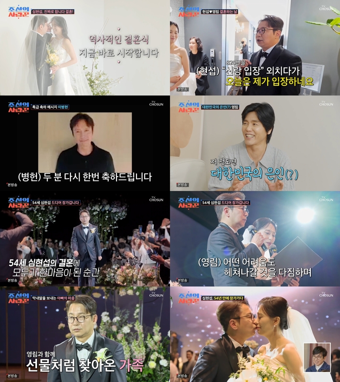 ‘조선의사랑꾼’.사진ITV조선‘조선의사랑꾼’방송캡처코미디언심현섭이1400명하객의축복속결혼식을올렸다.19일방송된TV조선‘조선의사랑꾼’에서는심현섭의결혼식현장이공개됐다.이날심현섭은“결혼식사회본것만820쌍정도된다.820번을‘신랑입장’외치다가오늘은내가입장한다”며설레는마음을드러냈다.심현섭이“어제자면서정영림과두번째만났던때가떠올랐다.이미그때(정영림이나에게)사랑에빠졌던것같다”고너스레를떨자정영림은“어디서나온자신감이냐”라고해웃음을자아냈다.결혼식장에는인맥의척도인화환이가득채워졌다.이가운데이병헌이보낸화환이눈길을끌었다.홍보일정으로결혼식에불참한이병헌은영상으로마음을전했다.이병헌은“신랑심현섭과신부정영림의결혼을진심으로축하한다.두사람이건강하고행복한결혼생활이어가길바란다.다시한번축하한다”고말했다.여기에심은하가보낸축하난도눈길을끌었다.결혼식일주일전심현섭에게따로전화한심은하는“나는TV를안봐서몰랐는데(소식을듣고)너무잘됐다고생각했다.너무축하한다”고축하를건넸다.이어“결혼준비많이힘들지않냐.따로식사한번하자”고했다.김준호,김지민,이홍렬,허동환,김윤경등은신부대기실을찾아정영림과인사했다.특히김윤경은“심현섭거둬줘서너무감사하다.나중에다갚겠다.고맙다”고말했다.이를본최성국은“대한민국이다정영림에게고마워하고있는것같다”고농담했다.드디어시작된결혼식.심현섭은자신의이름을외치는하객들을뒤로한채버진로드를걸었다.이후아버지의손을잡고등장한정영림의손을꼭잡았다.이어혼인서약서와성혼선언문낭독,심형래의축사,설운도와김다현의축가가진행됐다.부모님에게감사인사를올리기앞서심현섭은“나도이제새로운가족이생기는게실감이났다.정영림에게고마웠다.나에게도아버지,어머니가생겼다는생각에좋았다”고말했다.이후심현섭은뒤늦게만난인생의동반자정영림과함께많은사람의따뜻한축복속새로운출발을위한힘찬발걸음을내디뎠다.[이세빈스타투데이객원기자]Copyright©스타투데이.무단전재,재배포및AI학습이용금지