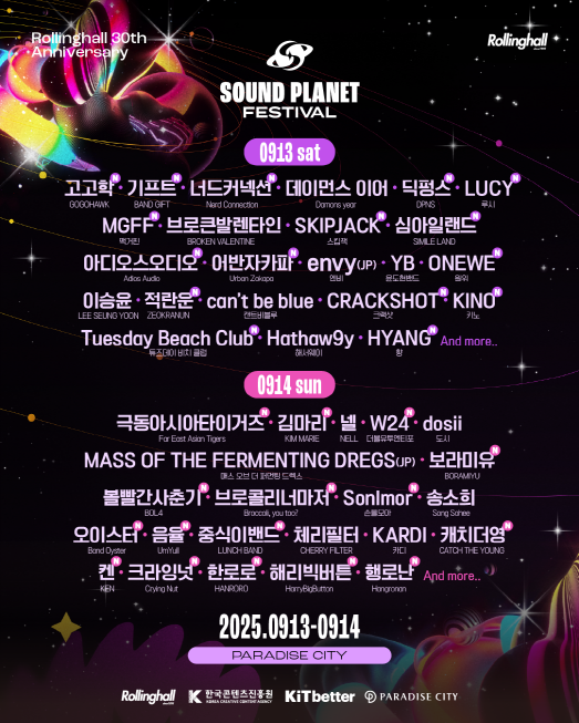 '사운드플래닛페스티벌2025(SOUNDPLANETFESTIVAL2025)'2차라인업이공개됐다.iMBC연예뉴스사진롤링홀측은19일보도자료를통해총32팀으로구성된'사운드플래닛페스티벌'2차라인업을오픈했다.오는9월13일토요일과14일일요일양일간파라다이스시티(PARADISECITY)에서펼쳐지는'사운드플래닛페스티벌2025'는'FeeltheWaves,TouchtheStars'라는슬로건아래음악을통해현실을벗어난새로운차원의감각을경험하는무대로꾸며진다.이날공개된2차라인업에따르면크라잉넛,어반자카파,볼빨간사춘기,루시(LUCY),중식이밴드,딕펑스,브로콜리너마저,해리빅버튼,크랙샷,아디오스오디오,오이스터,기프트,너드커넥션,맥거핀,원위(ONEWE),김마리,보라미유,한로로,켄,키노(KINO),W24,고고학,음율,튜즈데이비치클럽(TuesdayBeachClub),행로난,스킵잭,손을모아,심아일랜드,향(HYANG),캐치더영,극동아시아타이거즈,적란운등총32팀이무대위에오른다.롤링홀김천성대표는"이번2차라인업에32팀이이름을올렸다.무대구성이지금껏본적없는음악의도시,음악의천국,진정한음악의다양한장르를볼수있는페스티벌을준비했다.또아직공개되지않은비밀스러운라인업들이준비되어있다.9월13,14일사운드플래닛페스티벌로오시기바란다"라고전했다.한편'사운드플래닛페스티벌2025'의일반티켓은5월21일오후2시부터멜론티켓을통해단독오픈되며페스티벌에대한자세한정보와프로그램들은공식홈페이지와SNS채널을통해순차적으로공개될예정이다.iMBC연예김종은|사진출처롤링홀Copyright©MBC연예.무단전재및재배포,AI학습금지.