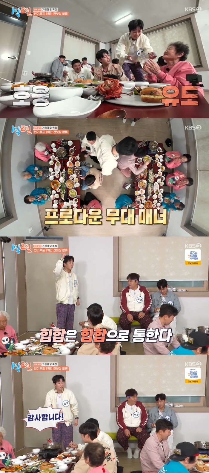 사진IKBS2‘1박2일시즌4’딘딘이할머니들인기투표에서1위를차지했다.18일오후방송된KBS2예능프로그램‘1박2일시즌4’(이하‘1박2일’)에서패배팀인옥금팀(문세윤,딘딘,이준)은한명은구제해준다는제작진의말에할머니들상대로인기투표를진행했다.이날방송에서문세윤은부끄러움을무릅쓰고트로트를열창했고,딘딘은“제가‘딘딘은딘딘’이라고하면똑같이따라해주셔요”라며랩공연을펼쳐‘칠곡할미넴’의호응을얻었다.이준은알통노출과트로트와춤을선보였다.결국인기투표1위는딘딘.딘딘은“감사합니다!힙합!”이라며할머니들의호응을이끌었다.그러나할미넴이“자리도많은데와서먹어”라며멤버들을챙기자패배팀도행복한저녁상을함께했다.‘1박2일시즌4’는매주일요일오후6시10분KBS2에서만날수있다.[서예지스타투데이객원기자]Copyright©스타투데이.무단전재,재배포및AI학습이용금지