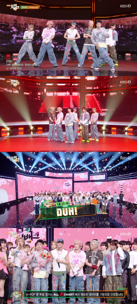 KBS2TV'뮤직뱅크'방송캡처.그룹피원하모니(P1Harmony)가음악방송2관왕에올랐다.피원하모니는지난16일방송된KBS2TV'뮤직뱅크'에서신곡'더!'(DUH!)로1위를차지했다.이를통해MBCM,MBCevery1'쇼!챔피언'에이어음악방송2관왕에등극했다.이날피원하모니는'더!'무대를통해흔들림없는라이브실력과믿고보는퍼포먼스를선보였다.프리스타일댄스에중점을둔안무는자유분방하면서파워풀한에너지를선사하며팬들의눈과귀를사로잡았다.1위수상후피원하모니는"상받을수있게만들어준피스(팬덤명)감사하다.무대에서는이유도,앨범을발매하고여러분을만나러다니는이유도모두피스여러분께있다.함께고생하는스태프분들께도감사하다"라며소감을전했다.'더!'는정의롭고겸손한기존의히어로와는다른,'내가앉는자리,내가걸어가는길이답'이라는내용으로피원하모니의자신감과남다른존재감을표현한곡이다.지난8일발매된후한터차트기준초동44만3108장의판매고를기록하며자체최고기록을경신했다.유지혜엔터뉴스팀기자[email protected]사진='뮤직뱅크'방송캡처Copyright©JTBC.무단전재및재배포금지.