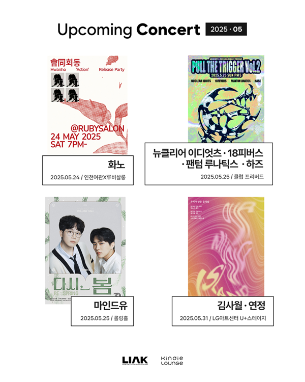 저마다의색깔과에너지를지닌아티스트들이생동감넘치는무대로관객들을맞이한다.킨디라운지는강렬한메시지와창의적인무대로무장한아티스트들의공연추천을통해,음악이가진다양한매력을만날수있는시간을제안한다.함께만들고,함께호흡하며완성되는다채로운무대들을소개한다.루비레코드소속밴드‘화노(Hwanho)’가오는5월24일(토)오후7시,인천모텔X루비살롱에서특별한릴리즈파티‘會同-회동’을개최한다.새싱글‘Action’발매를기념해열리는이번공연은단순한관람을넘어,관객이직접참여하고함께만들어가는자리다.단체채팅방을통해선착순으로신청곡을받아셋리스트를구성하며,공연당일에는화노시그니처칵테일판매와100%당첨뽑기이벤트도마련돼더욱특별한경험을선사할예정이다.킨디라운지는강렬한메시지와창의적인무대로무장한아티스트들의공연추천을통해,음악이가진다양한매력을만날수있는시간을제안한다.함께만들고,함께호흡하며완성되는다채로운무대들을소개한다.노머시컴퍼니가진행하는시리즈공연‘PULLTHETRIGGERVol.2’가오는5월25일(일)오후5시,홍대클럽프리버드에서개최된다.이번무대에는뉴클리어이디엇츠,18피버스,팬텀루나틱스,하즈등강렬한사운드로무장한밴드들이참여한다.메탈과펑크록의다이내믹한사운드와뜨거운열기를제대로느낄수있는이번라인업은공연장을에너지로가득채울예정이다.2인조밴드‘마인드유(MINDU)’가5월25일(일)오후5시,홍대롤링홀에서단독콘서트‘다시,봄’을선보인다.이번무대는롤링30주년을기념하는특별공연으로,오랜시간사랑받아온마인드유의음악세계를밀도높게경험할수있는자리다.특유의섬세한감성과따뜻한메시지를담은라이브로,관객들에게부드러운울림을전할예정이다.싱어송라이터김사월과연정이콘서트‘우리가만든음악섬’에출연한다.이번공연은weete(위트)와유어썸머가공동주관하며,5월31일(토)오후7시,LG아트센터U+스테이지에서열린다.무대는관객사이중앙에설치된360도형태로구성되며,기분좋은취기와함께공연을즐길수있도록공연전주류를제공한다.감각적인공간연출과어우러져한층몰입감높은공연을선사할예정이다.한편,킨디라운지를운영중인한국음악레이블산업협회는소규모대중음악공연지원사업‘2025라라라온’의참여공연장과뮤지션을모집중이다.참가를희망하는공연장및뮤지션은오는18일오후6시까지신청서를작성해관련증빙자료와함께이메일로제출하면된다.[금빛나MK스포츠기자][ⓒMK스포츠,무단전재및재배포금지]Copyright©MK스포츠.무단전재및재배포금지.