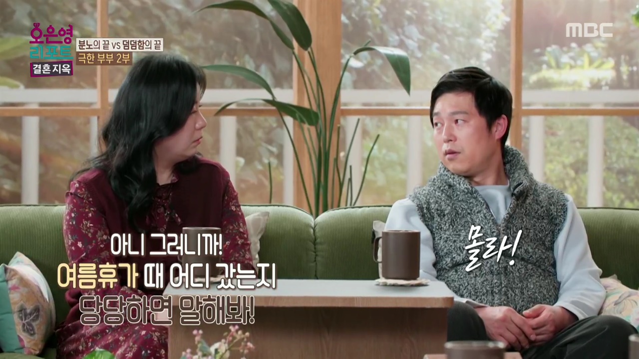 [리뷰]MBC오은영>[이준목기자]모든문제가오로지아내탓이라고생각하는남편,그런남편에게온갖비난과원망을들으면서도무심한아내,물과기름같이다른부부는과연화해할수있을까.12일방송된MBC부부상담솔루션<오은영리포트-결혼지옥>에서는'극한부부'의두번째이야기가그려졌다.황명진-강지애부부는경기남양주에서세자녀를키우고있는결혼10년차부부였다.부부는아내의권유로상가를인수하고식당을창업했으나,이과정에서막대한대출빚을지게되면서경제적갈등을빚고있었다.남편은모든문제의원인이아내탓이라고생각하며원망했고이혼까지심각하게고민했던것으로드러났다.남편은시종일관아내를못마땅해했다.아내는남편의질타에도아랑곳하지않고무심하거나성의없는반응으로일관했다.아내의습관적지각▲<오은영리포트-결혼지옥>중한장면ⓒMBC2편에서는아내의문제점도본격적으로다루어졌다.부부의갈등은직장이아닌가정내에서도이어지고있었다.남편은아내의이해할수없는생활패턴과문제해결방식에불만을드러냈다.부부의셋째아이가아파서아침일찍병원에데려가야하는상황이었지만,아내는병원이코앞이라는이유로시간이다되도록준비가전혀되어있지않았다.언짢아진남편은아이들과모두함께외출하여순서대로첫째부터먼저학교에등교시키라고다그쳤다.하지만아내는이런저런핑계를대며남편의이야기를받아들이지않고자신의방식을고집했다.결국아내가셋째만데리고잠시병원에다녀오는동안,잠에서깬첫째와둘째두아이만집안에그대로방치됐다.스케줄이꼬여버린아내는아이들의등교와본인의식당출근까지줄줄이지각하고말았다.남편은"아내는아무대책없이상황이닥쳐야움직인다"며불만을드러냈다.잠이많은아내때문에자녀들까지상습적으로지각하는일이빈번하다고.남편은아내의무책임한행동들이아이들에게도부정적인영향을미칠까걱정했다.정작아내는문제의심각성을전혀대수롭지않게여겼다.부디등원시간을지켜달라는어린이집선생님의부탁에도아내는개인사정을내세우며"자신이없다.못하겠다"고웃음으로무마했다.또한"정해진시간에와달라는게,아이들간식먹이고머리묶어주는일때문이지않나.제가대신해주니까(지각해도)괜찮지않을까"는황당한논리로공통의약속을가볍게여기는모습을드러내며패널들을당황하게했다.오은영은"성인보호자없이아이들만집에두고나가시면절대안된다.아무리짧은시간이라도집안에서안전사고가일어났을때8살과4살의아이가과연대처할수있겠나"며아내의부주의하고위험한행동을지적했다.부부는육아관의차이로도갈등을빚고있었다.남편은집에서는하루종일TV만보며아이들을제대로돌보지않는아내에대한불만을드러냈다.둘째가의자에서떨어져머리를바닥에부딪치는돌발상황이발생했다.한바탕소동이일어났지만아내는아이를잠시달래준뒤또다시TV에서눈을떼지못했다.얼마후제작진과의인터뷰에서아내는당시상황에대하여제대로기억도하지못하고있었다.부부의바쁜일상과갈등속에서,아이들은사각지대에위험하게방치되어있는경우가허다했다.아이들만있을때둘째가셋째의손가락을심하게물어버린사건이있었다.셋째는먹어서는안될스펀지를삼켰다가첫째의만류로겨우뱉어내기도했다.또한둘째는희귀질병인윌리엄스증후군(심혈관협작증)을앓고있어서부모의손길이더필요한상황이었다.부부는결국육아방식을놓고크게충돌했다.남편은떼를쓰고투정부리는아이들에게훈육의필요성을주장했다.하지만아내는"나는아직괜찮다.당신귀를막으라.나는들을만하다"며이번에는남편에맞서서언성을높였다.부부가서로날카로운대화를주고받는동안3살짜리막내는옆에서"소리지르지마"라며호소하고있었다.그러나감정이격해진부부에게아이의간절한외침은들리지않았다.부모의싸우는모습에두려움을느낀아이는결국식탁밑으로숨어버렸다.안타까운장면에부부와패널모두착잡한표정을감추지못했다.오은영이지적한우선순위오은영은"잘못을한아이들에게그순간먼저해야했을우선순위는,남편이나누구를탓하는게아니라'왜하면안되는지'설명하고교육하는것"이라고지적했다.자녀들의심리검사와부모와의놀이평가에서,아이들은함께보내는시간이더많은엄마보다아빠와의상호작용이더좋았던것으로나타났다.아내는본인도아직9살에불과한첫째에게더어린동생들을돌보는역할까지요구한것으로드러났다.이어"아내는매사를'본인위주'로생각하는성향이있다"고문제점을꼬집었다."아내는집단생활을하면서지켜야하는규칙과질서를중요하게생각하지않는다.아이들의등교시간이늦어진게아이들을위해서인가?오로지아내본인의생활에맞춘것이다.애들셋키우느라힘들어서그렇지?이렇게생각하면절대안바뀐다.부부의갈등에서끝나는문제가아니라아이들의가정교육이사라져버리기때문"이라고설명했다.아이들에대한훈육과통제를가볍게생각하는아내때문에,자녀들은'해서는안되는것'을정확히배우지못했다.오은영은"세상을살면서안되는것들,지켜야할것들이얼마나많은가.그런게다이집에서는구멍이나있다"라며"아내는'아이에게무엇을가르쳐야하는지'에대한기준보다는,'내가괜찮으면괜찮다'고생