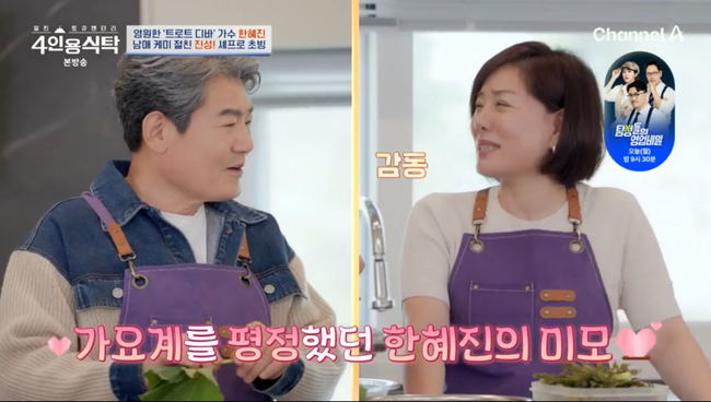 방송화면캡쳐[OSEN=김예솔기자]한혜진이2층대저택을공개했다.12일방송된채널A'절친토큐멘터리4인용식탁'에서는가수한혜진이동료인절친진성을초대했다.이날한혜진은사방이산으로둘러싸인주택단지에럭셔리한대저택을공개했다.한혜진의집은탁트인산뷰를자랑해눈길을끌었다.방송화면캡쳐한혜진은절친으로트로트가수진성을초대해함께요리를시작했다.진성은"친여동생처럼무슨일있을때마다곁에서지켜주고싶은사람"이라고말했다.한혜진은"오빠네집은몇번갔는데내가초대한건처음이다"라고말했다.한혜진은"내가음식을워낙못한다.원래는외부셰프를초빙하려고했는데진성오라버니가요리를굉장히잘하시니까"라고말해웃음을자아냈다.방송화면캡쳐진성은요리의생명력을위해머위를준비했다고말해눈길을끌었다.한혜진은팬에게선물받은야생두릅을꺼냈다.한혜진은진성의진두지휘에맞춰요리를준비했다.진성은한혜진의과거를이야기하며"제일부러워했던양반"이라고말했다.진성은"지금은미모가살아있지만그땐더예뻐서사내들의가슴을설레게했다"라고말했다.하지만한혜진은"이제갔다"라고말해주위를폭소케했다.방송화면캡쳐진성은"나도그중한사람이었다"라고말했다.한혜진은"알게된세월이30년이넘었다.그때솔직히무서웠다"라고말했다.진성은"무명시절이길어서세상의시름을안고있었다"라고회상했다.이에한혜진은"지금은알랭드롱같다"라고칭찬했다./[email protected][사진:채널A'절친토큐멘터리4인용식탁'방송캡쳐]Copyright©OSEN.무단전재및재배포금지.